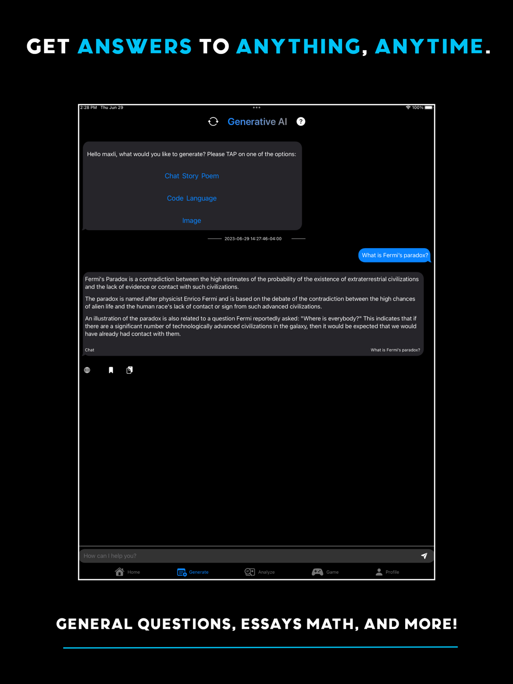 Generate text using any of our text tools: text generation, poem, short story. Our text generation tools are capable of answering any type of questions, giving poems and essays, code, offer advice, and more!