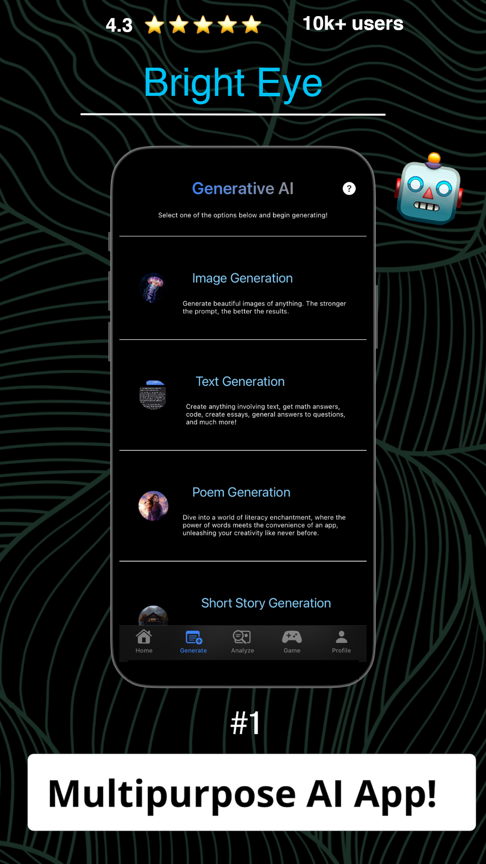 Bright Eye is a multipurpose, generative, gaming and analytical AI app. We combine text and image generation, and computer vision-based tools, with an immersive social environment, to provide a unique mobile experience for individuals (AI4I, Artificial Intelligence for Individuals).