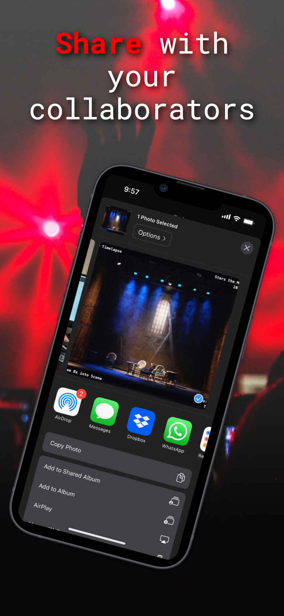 Overlay your cue information onto videos and photos! No proprietary formats, and no one else on your team needs a license. Empower your collaborators and share videos directly from the photos app.