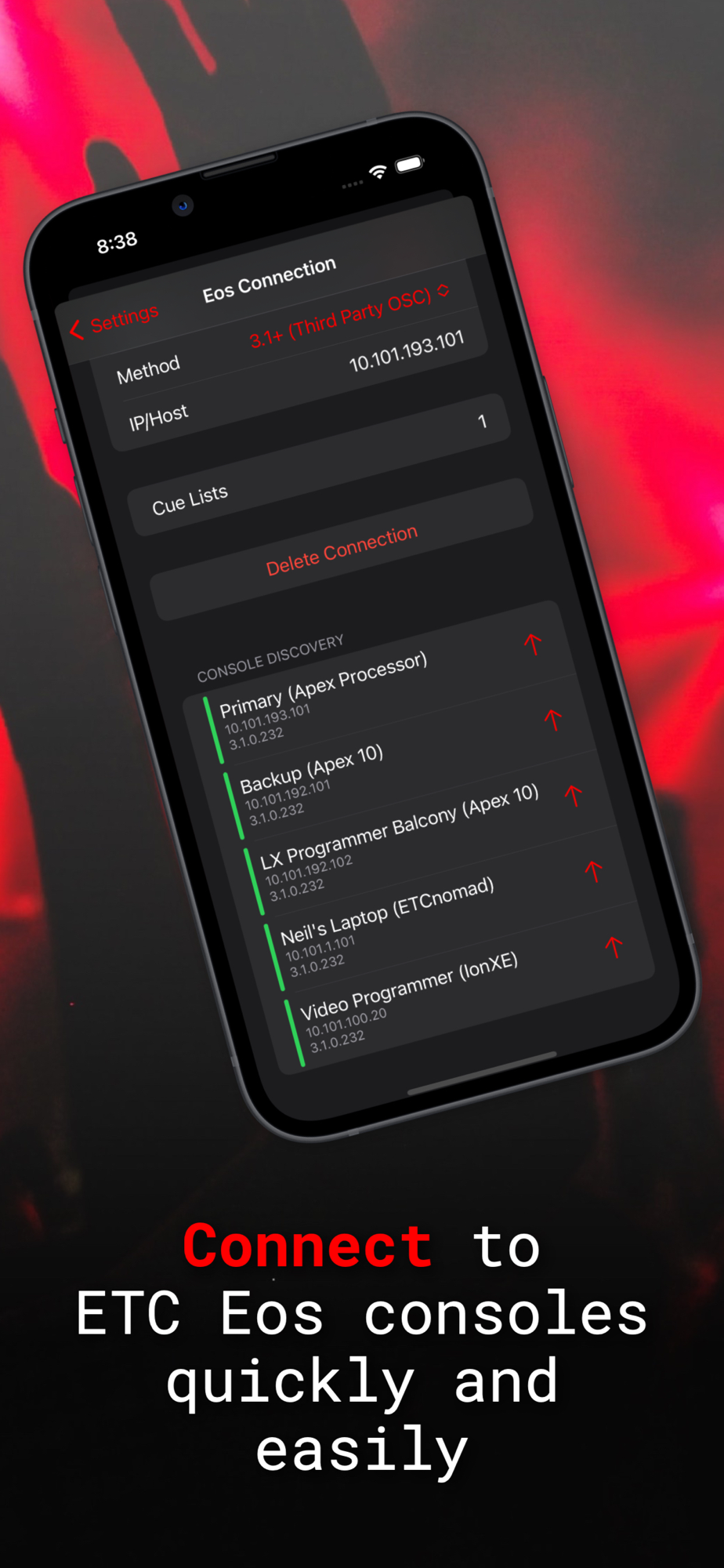 Not a tech wiz? No worries, Vor automatically discovers ETC Eos™ family consoles on your lighting network so you don't have to fumble around with OSC port numbers.
