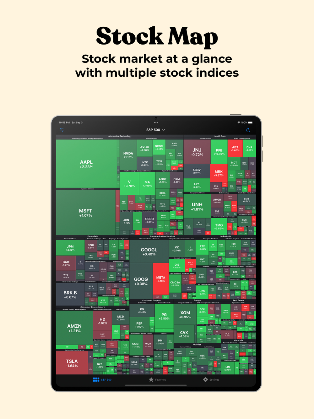 Stock Map visualizes all the S&P 500, Nasdaq 100, and Dow Jones stocks in a single view with a heat map/treemap and you can see the companies, sectors, and industries with a single look.