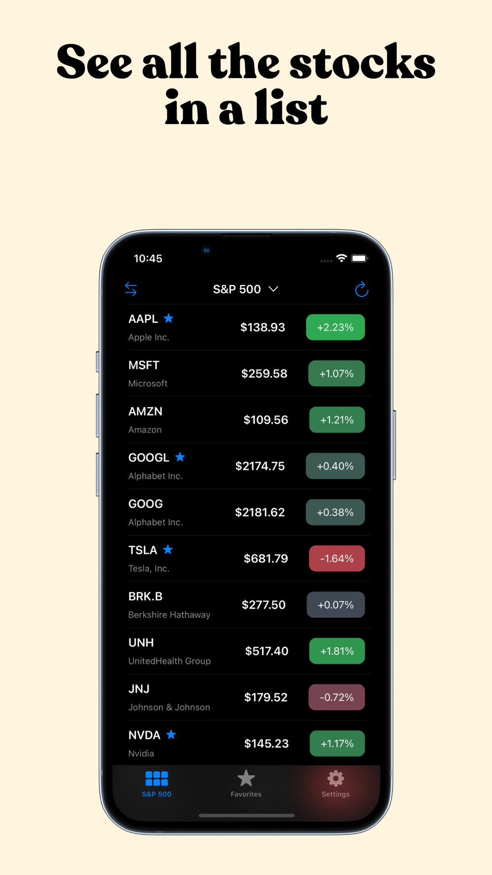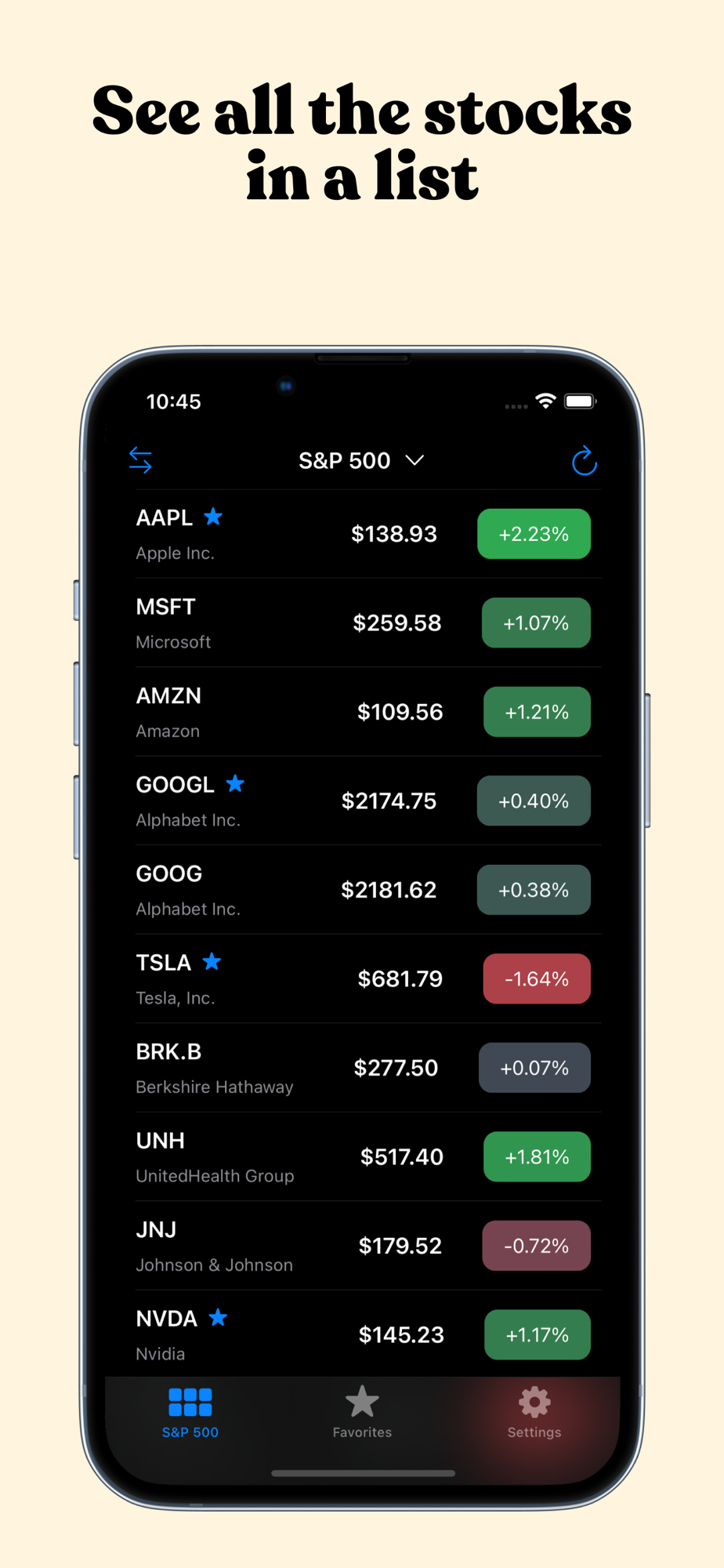 Main page displays S&P 500 stocks by default. But that view can be changed to display Nasdaq 100 or Dow Jones stocks by tapping on the title at the top.