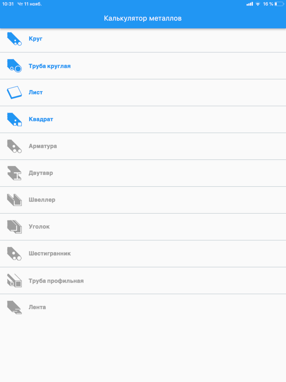 - 11 видов металлопроката (круг, труба, пруток, лист, шестигранник, квадрат, двутавр, труба профильная, лента)