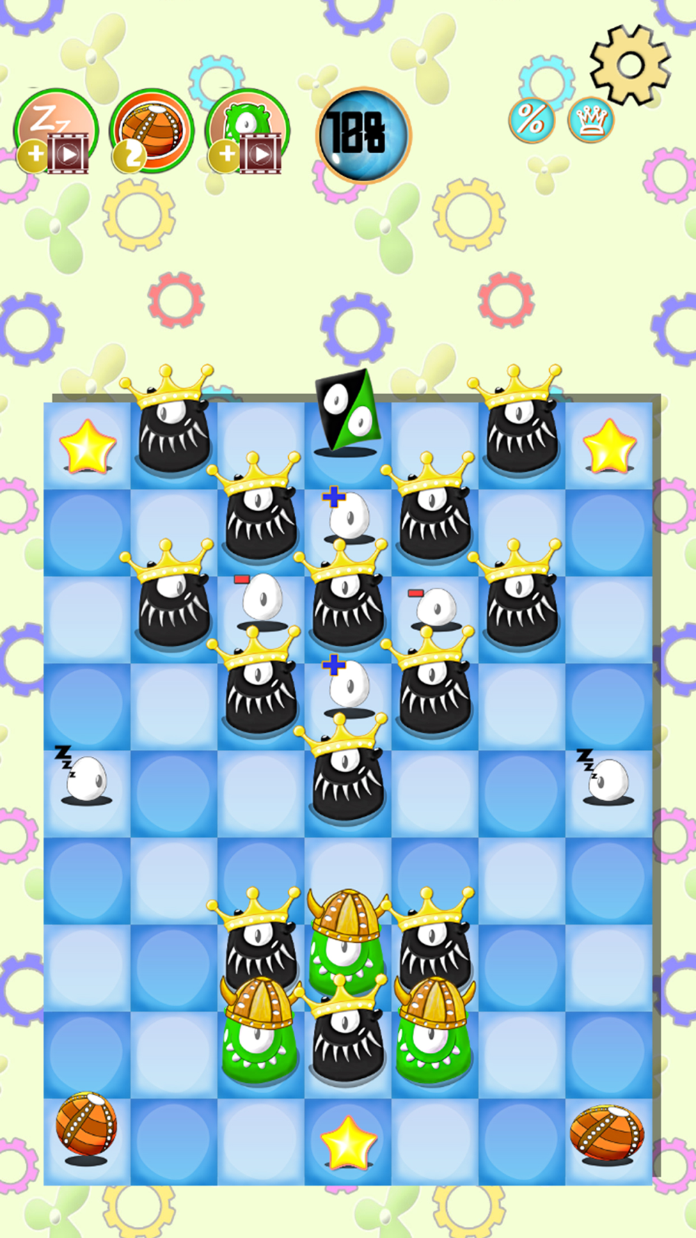 Cyclopsy rules are similar to classic board games such as Checkers, Reversi or Ottelo. But unlike classic board games, the game provides an extended gameplay. The player's chips are cyclops, the player and the enemy move alternately. On Cyclops who have the opportunity to make a move, a helmet appears, and when you click on them, options for a move appear. When you click on an option to move, the Cyclops jumps to a new location, and the enemy's cyclops turn into their own. If there are no options to make a move, the player skips a move. After the player and the opponent have made a move, two cyclops, black and green, appear on the field in a random place. The game continues as long as at least one player has moves.