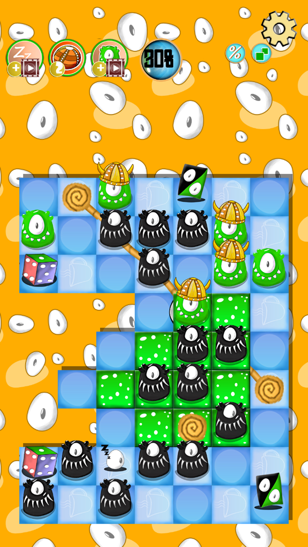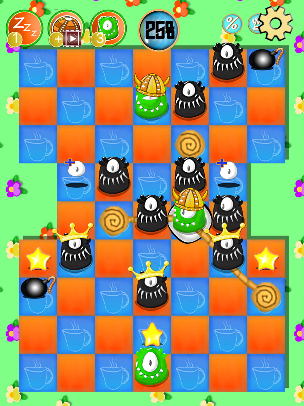 The game is fighting green against black cyclops. Additional bonuses appear on the field at different levels:
