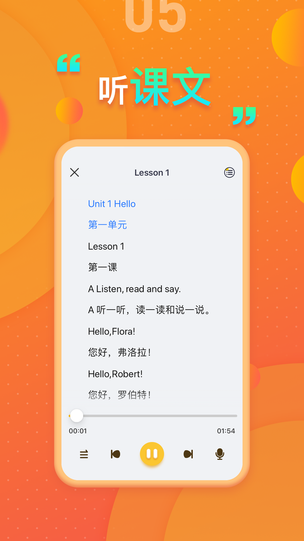 【听课文】:听课文是一项核心功能,音质高清,与课本内容同步,可点击任意一句,可录音跟读。