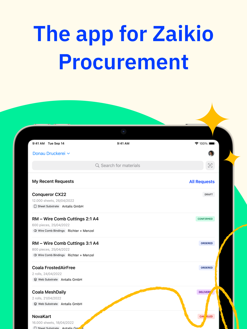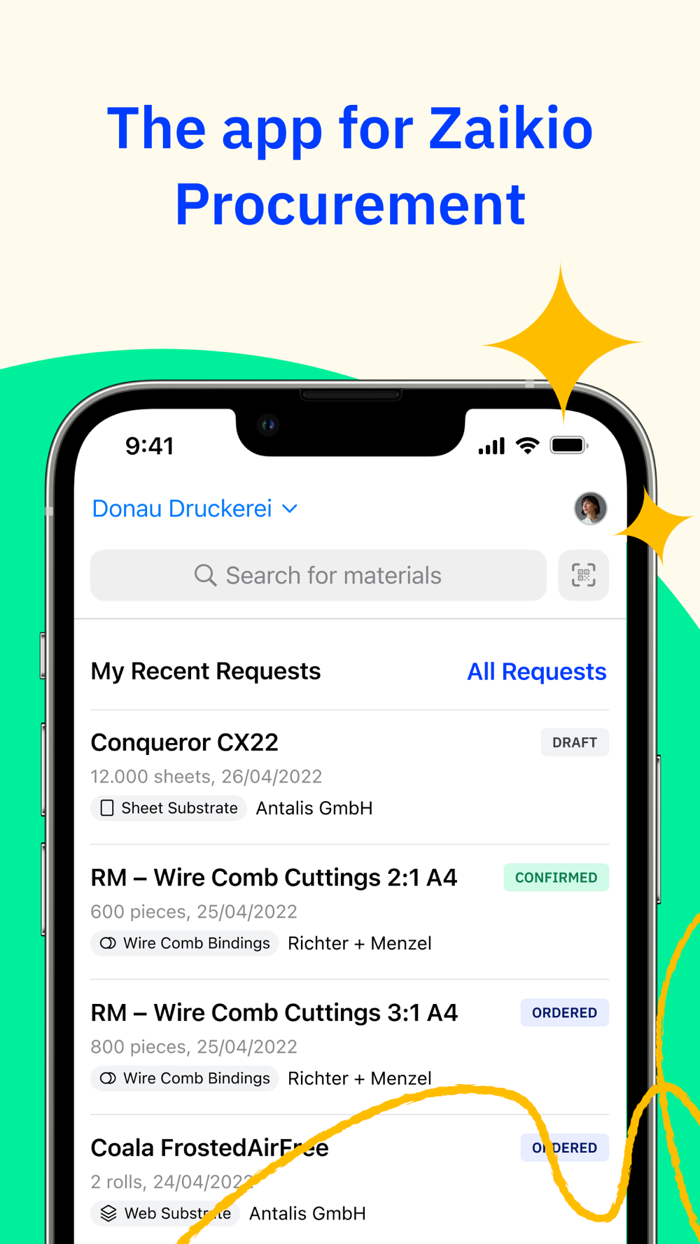 The app for Zaikio Procurement is finally here! It makes it quick and easy for staff to request papers and other materials which then can be ordered seamlessly in Zaikio Procurement.