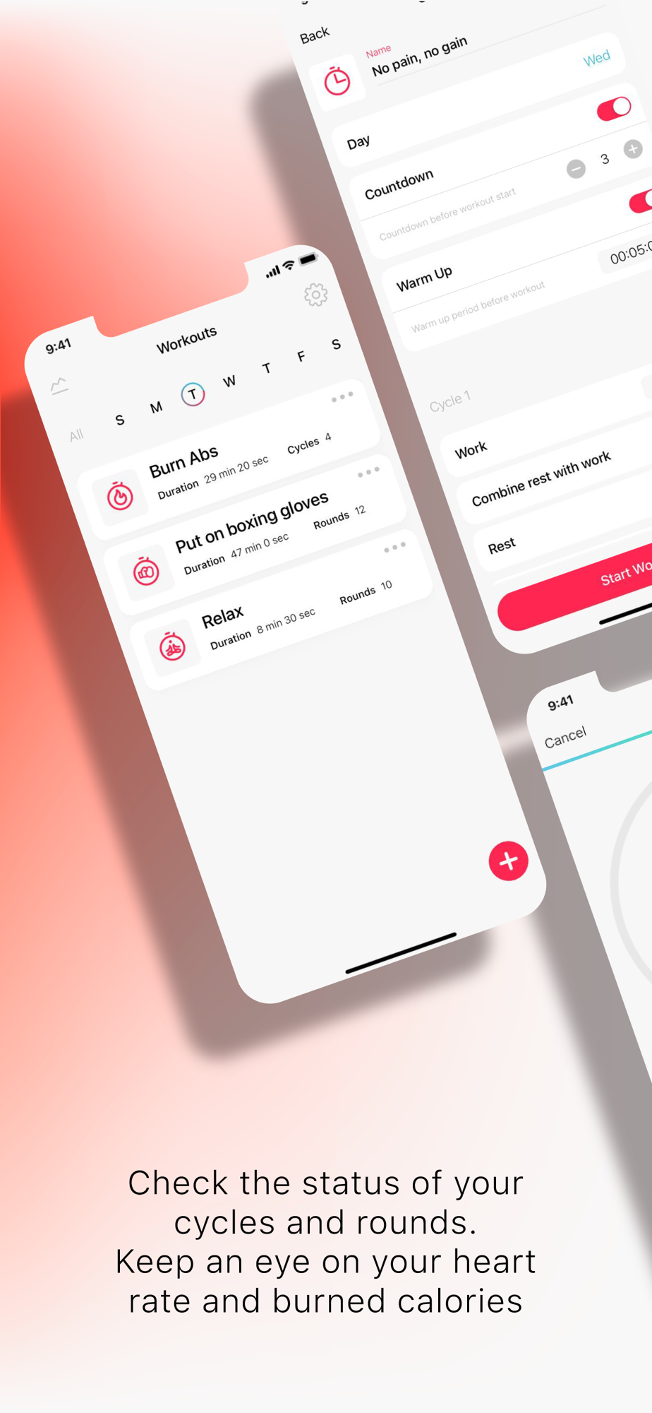 You can set up any workout intervals such as warm up, work, rest between rounds, rest between cycles, cool down and also you can set number of rounds and cycles. During the workout application monitors you heart rate, burned calories and uses vibration to indicate start and end of the workout activity.