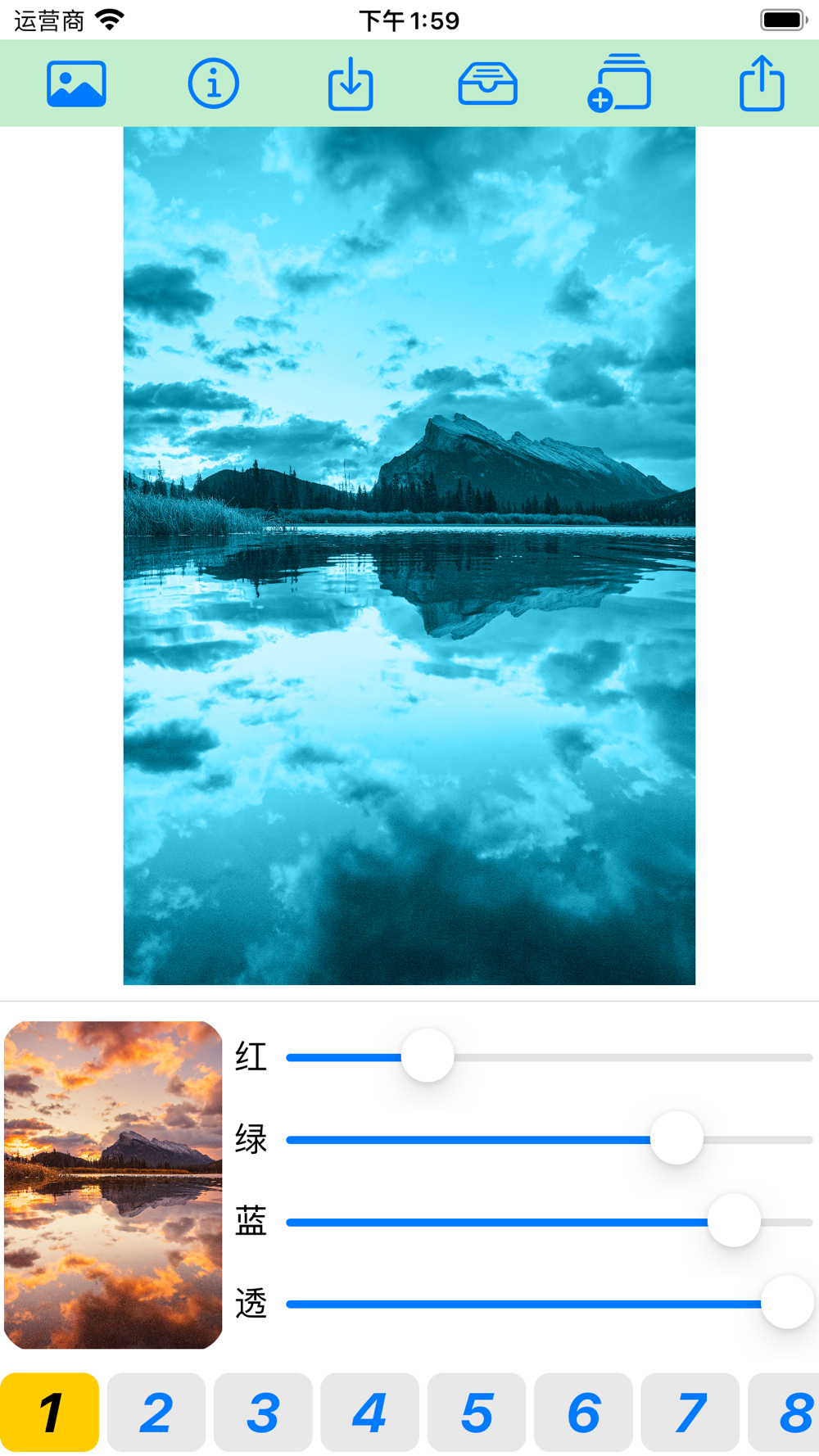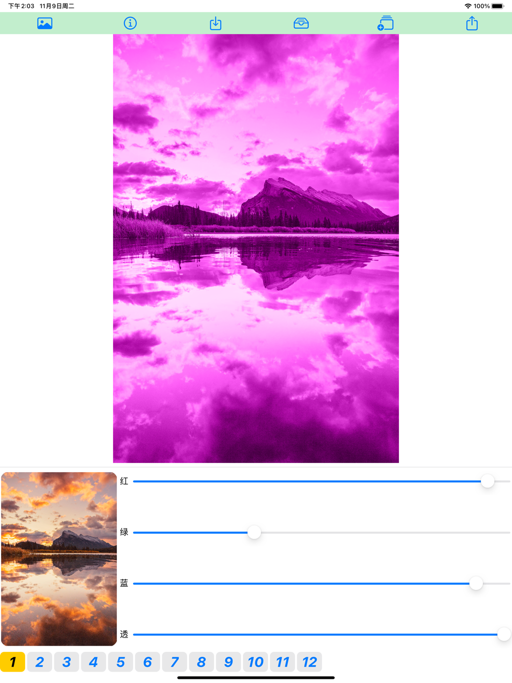 这个app提供12 BlendMode 让你改变相片的色彩, 藉着调整红绿蓝及透明度, 使相片成为你喜爱的色彩.