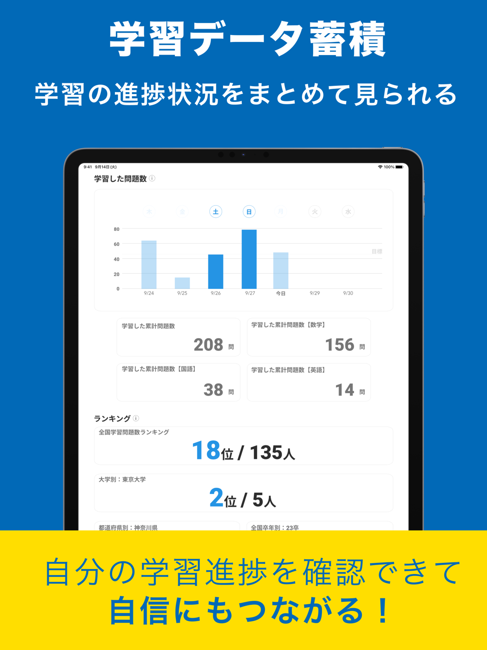 カスタム復習:理解度別、学習時別、分野別に自分で問題の範囲を選択して学習。