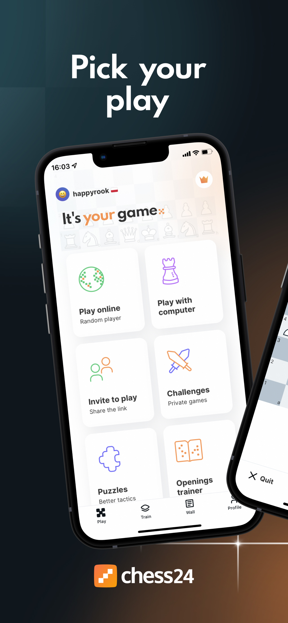 The place to play and follow chess online. Play against chess24 users all around the globe or versus a computer opponent of your choosing. Challenge other players or invite your friends to play. Have fun and improve with over 80,000 tactics puzzles.