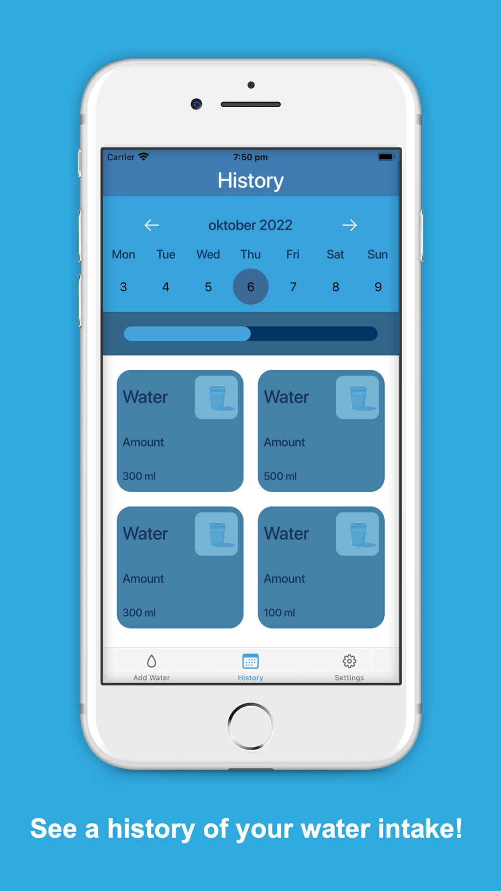 The app features notifications to help you not forget to drink enough water. There is also a "today's" water intake screen, which shows you your water intake for that day, together with some neat facts & tips. You also have the ability to see your water intake history, so that you can get an excellent overview of your drinking habits!