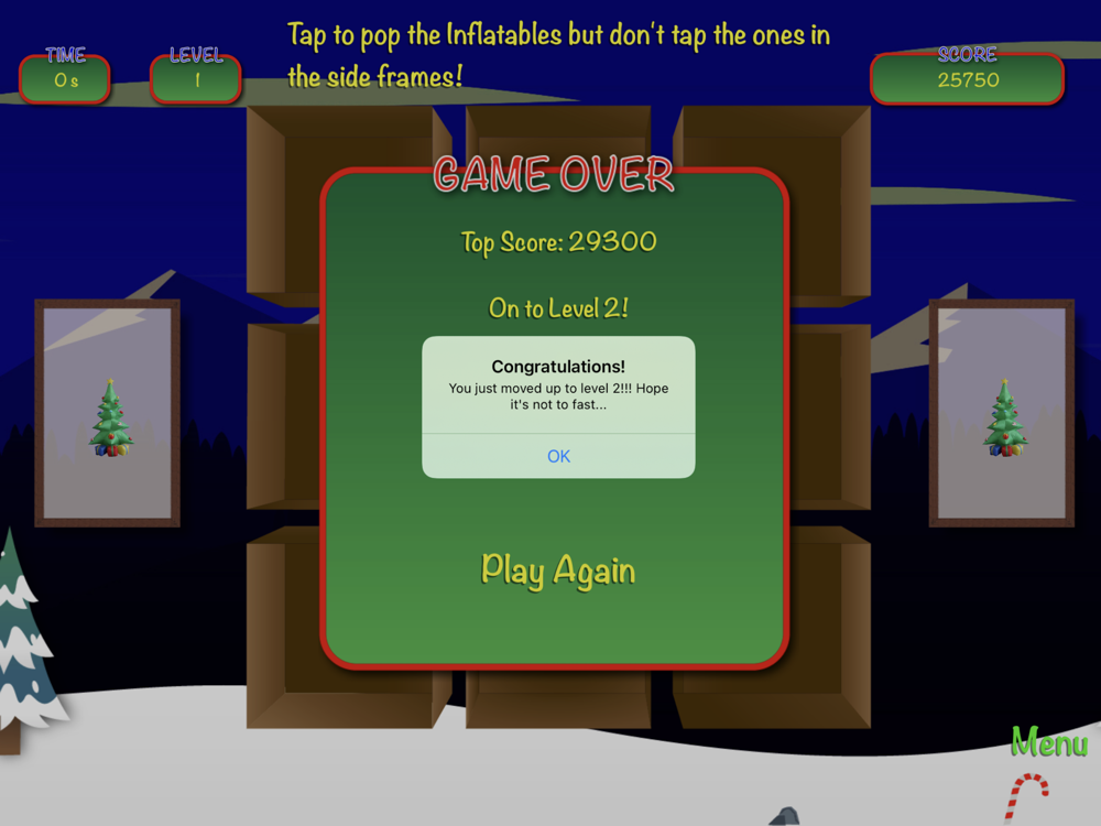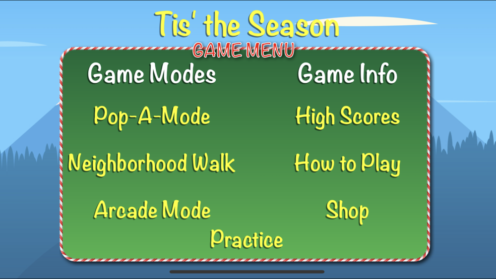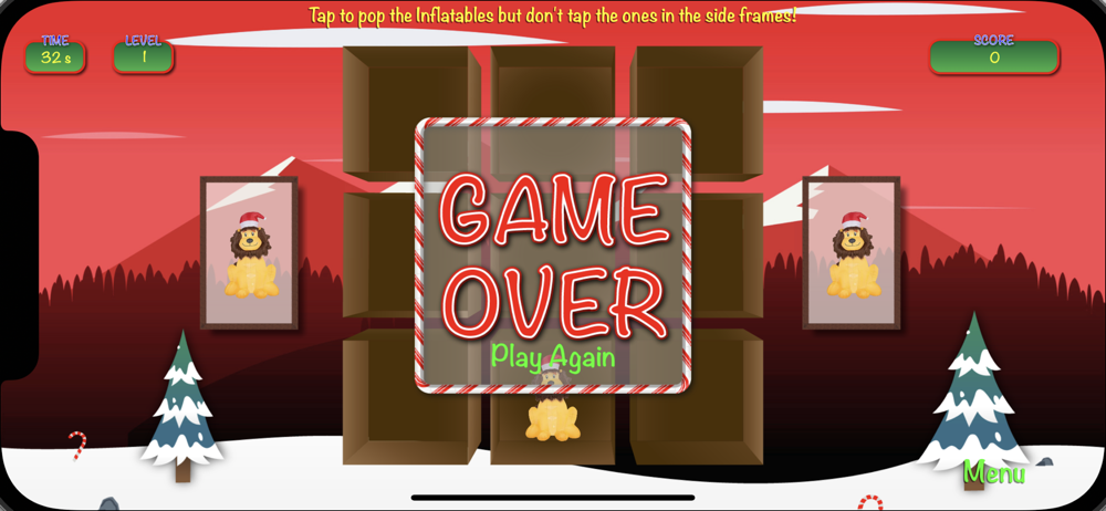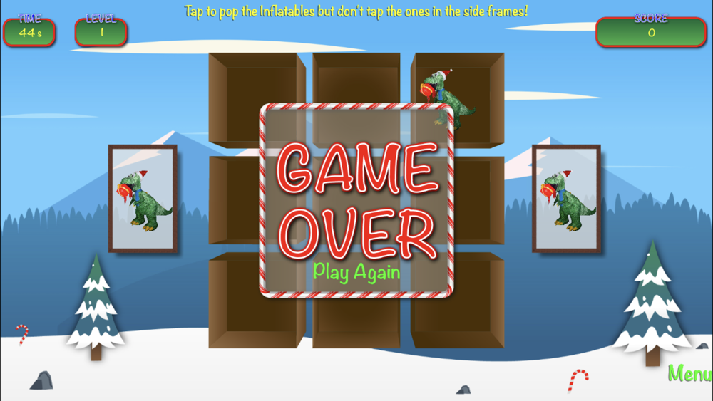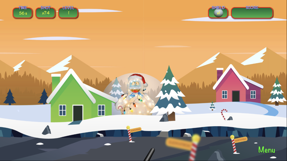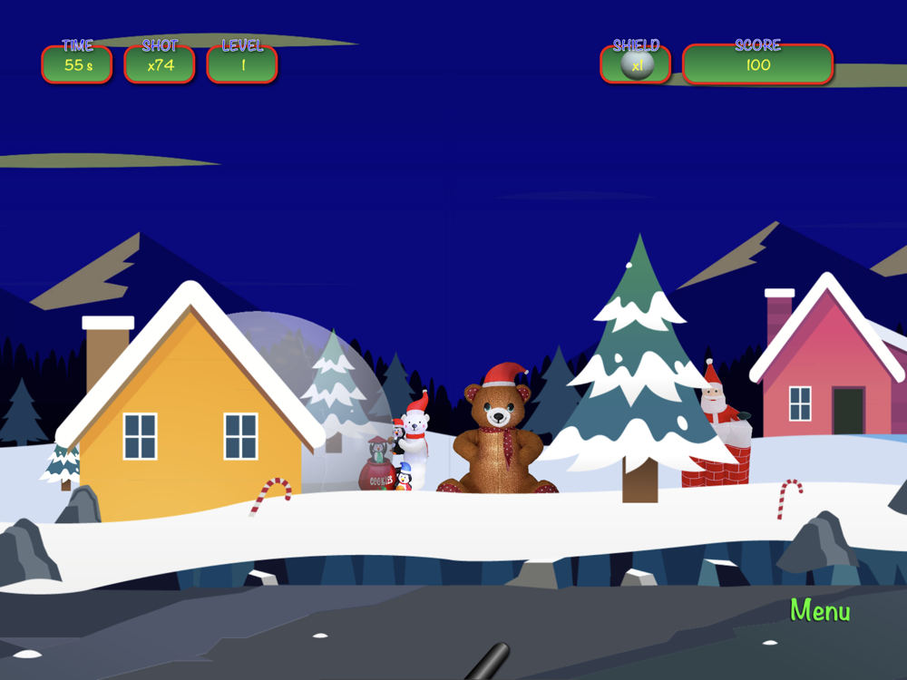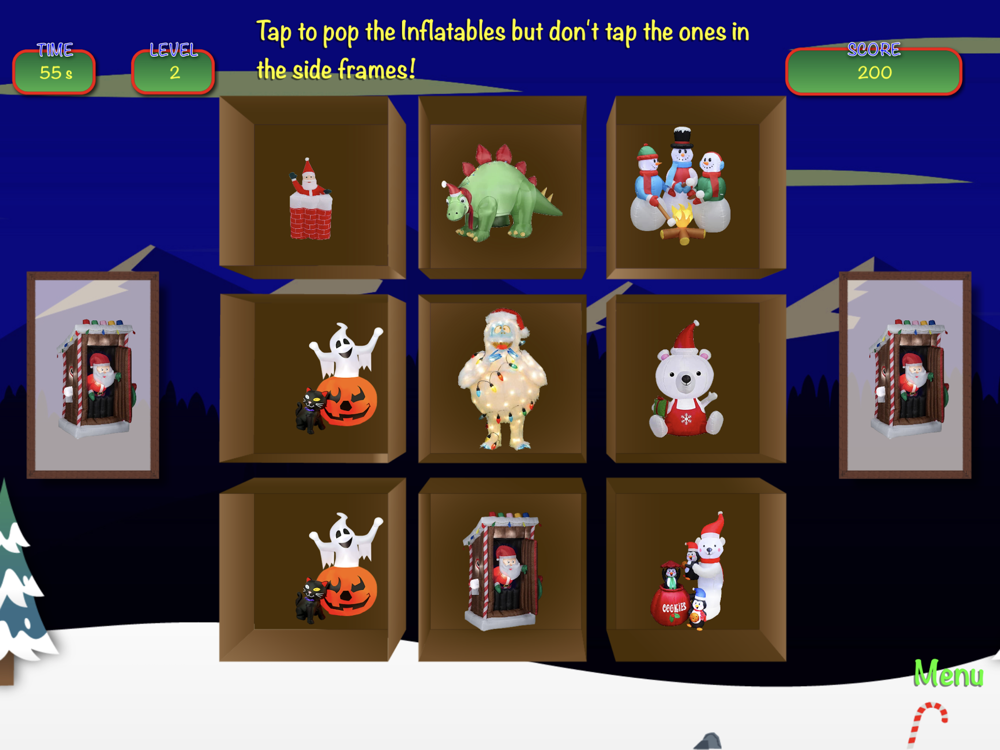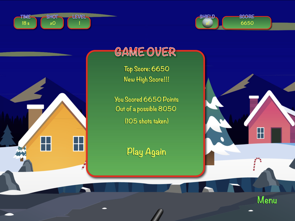 Pop-A-Mode - In this mode, Inflatables appear for a limited time and you have 60 seconds to score as many points as you can. Each inflatable takes one shot to remove, but be careful because any of the classic Christmas inflatables will take away your points. To shoot the inflatable tap on it as it shows up on the screen. It will rise up from the scene stay for a second, and then disappear by receding back into the scene. It can be shot in all 3 actions, but is harder to hit when it is inflating or deflating. Score extra points for any Santa or Snowman inflatable that doesn’t make any sense. Earn extra shots for taking out the leftover Halloween inflatable, and do not hit the Yeti inflatable or it is Game Over!