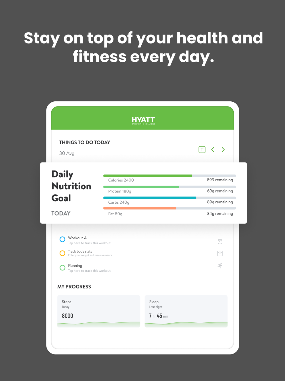 The Hyatt Training app is a customized app for Hyatt Training members. You can start tracking your workouts and meals, measuring results, and achieving your fitness goals, all with the help of your personal trainer.