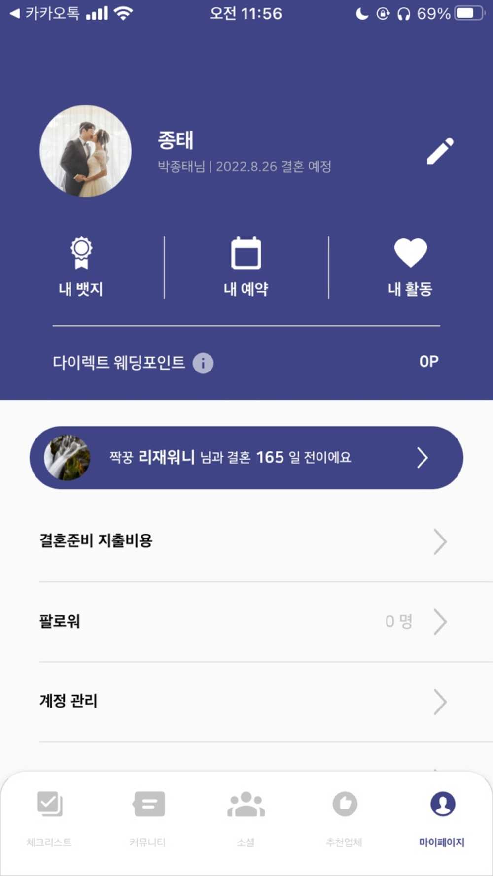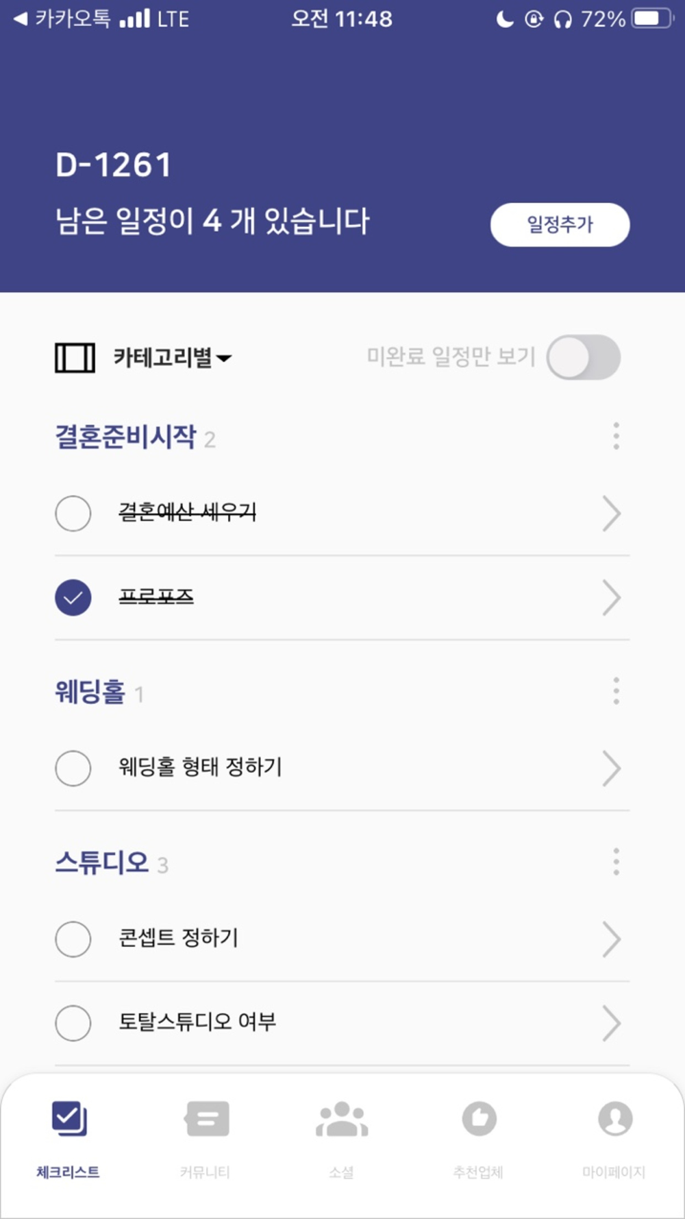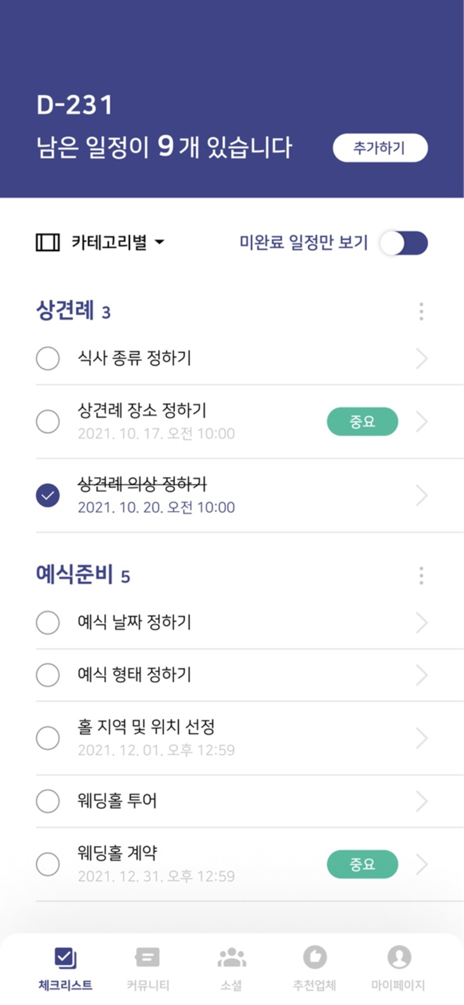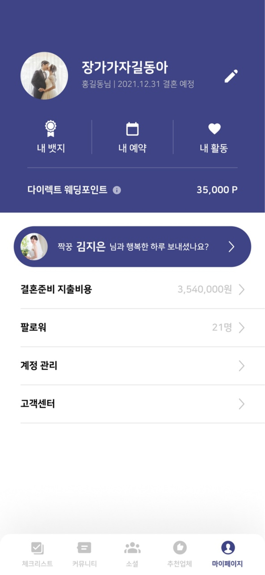 결혼할 상대를 등록하고 같이 체크리스트를 관리할 수 있으며 커뮤니티와 업체 추천 기능이 있습니다.
