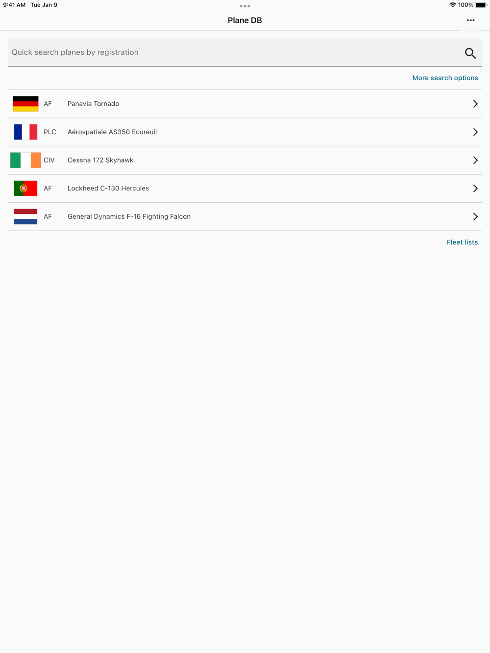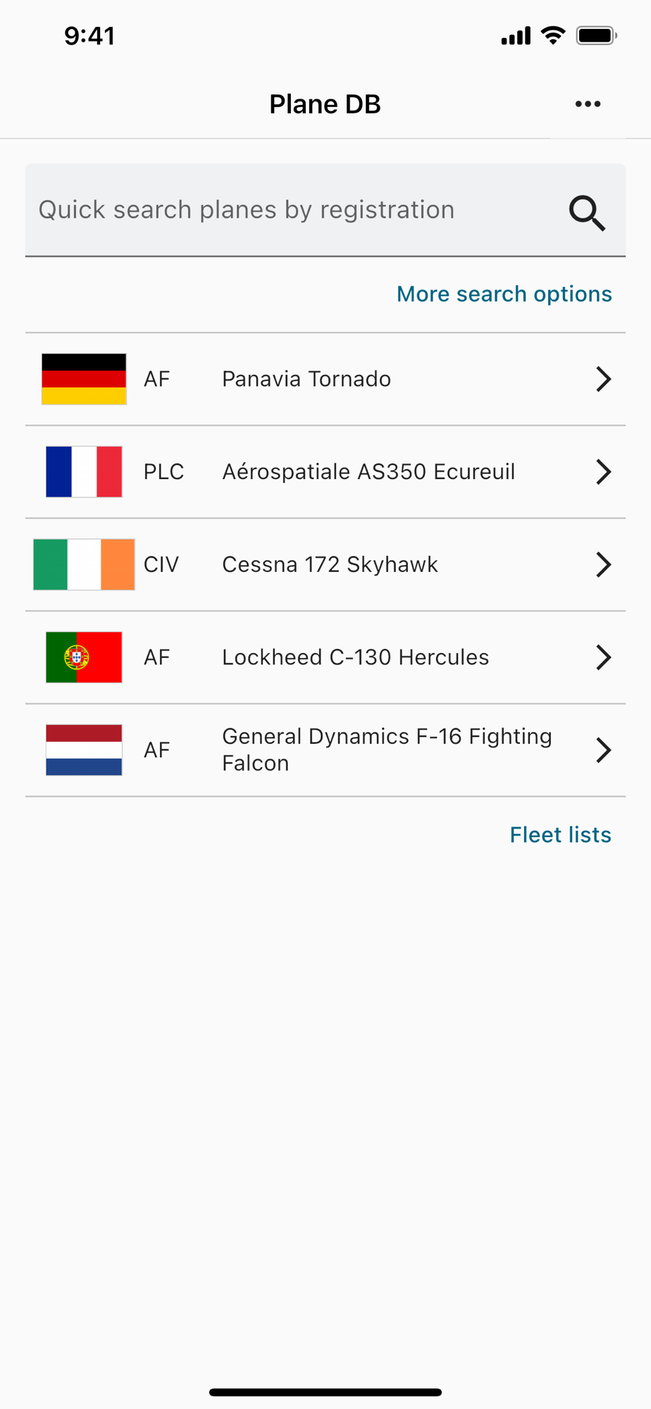 This app gives you direct access to the Spottingmode plane database. Search individual planes or full fleet lists. Check when and where a plane was seen, or where it can be found in a museum right now.