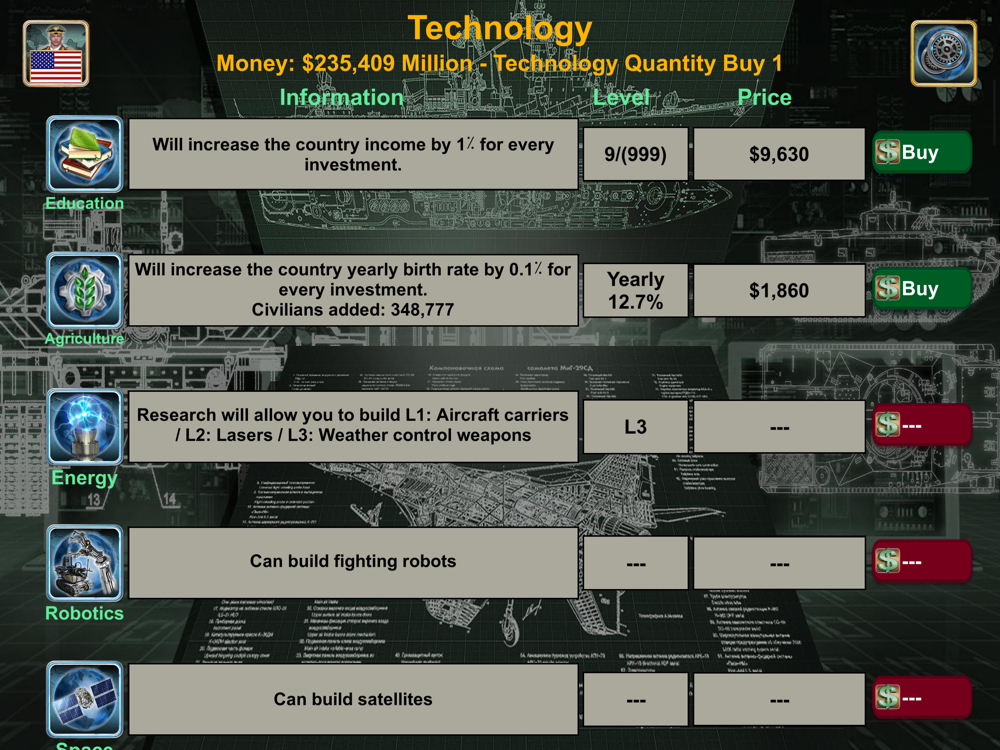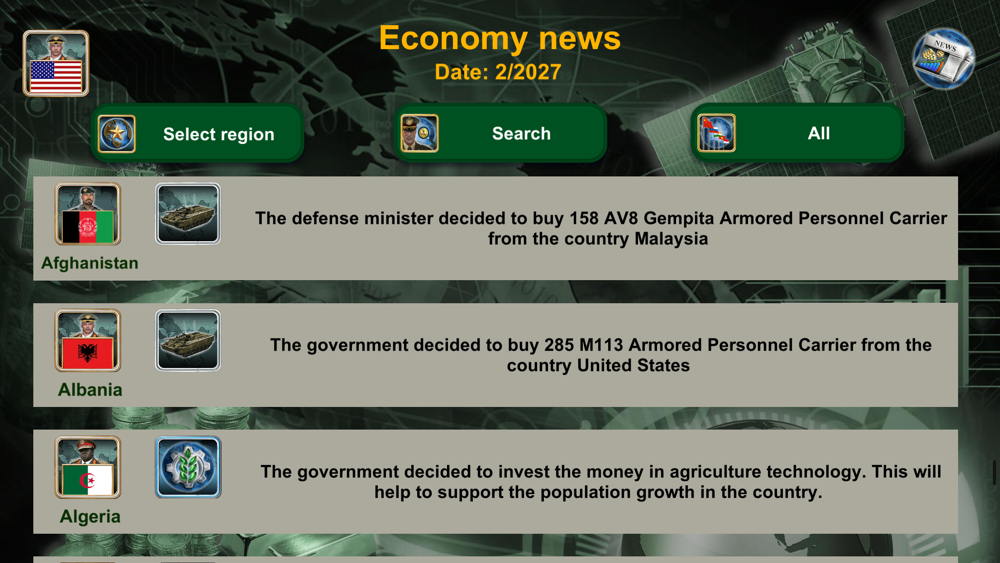 The game offers a wide range of features, including access to global Weapons Suppliers, a Spy Center, a War Room, Diplomats, the United Nations, an Economy system, Technology, and World News Distribution (Economy, Relations, Spy, and War). All this is powered by advanced Artificial Intelligence.