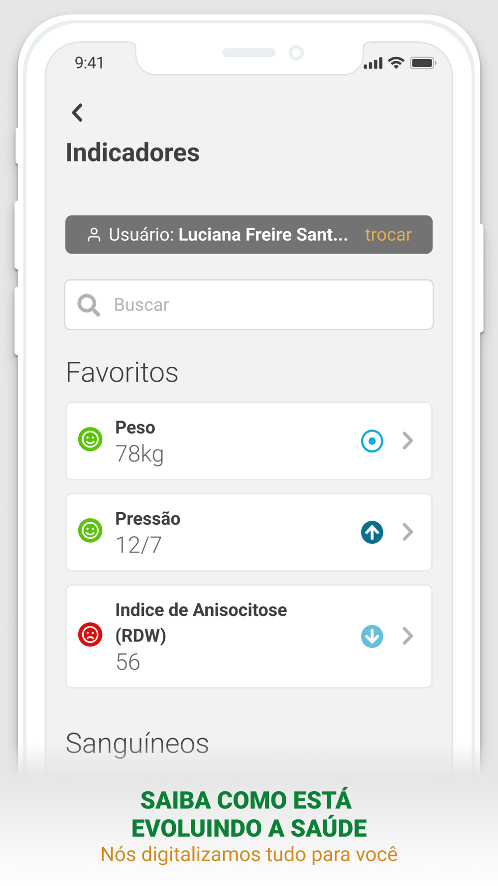 - Indicadores de saúde: Saiba se a saúde do seu parente sênior está evoluindo bem através de indicadores e gráficos. Tenha informações que o ajudem na gestão de saúde da sua família mesmo que você esteja distante.
