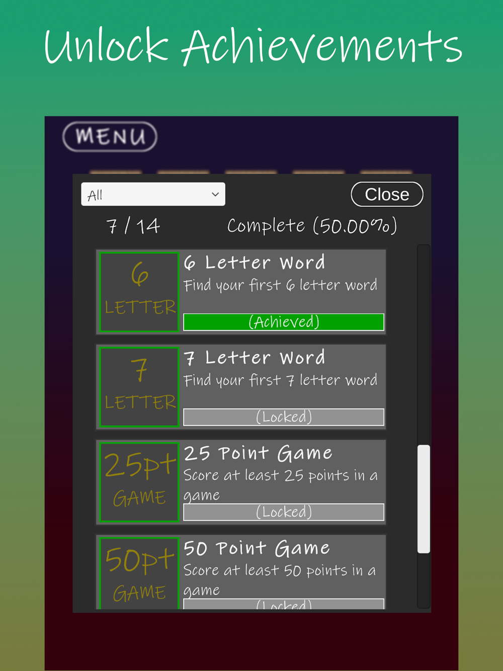 You have 5 rounds to score as many points as possible by creating words. The catch? Each round you can only flip over 7 tiles. Test your memory while remembering key letters that may help you create longer words and score more points!