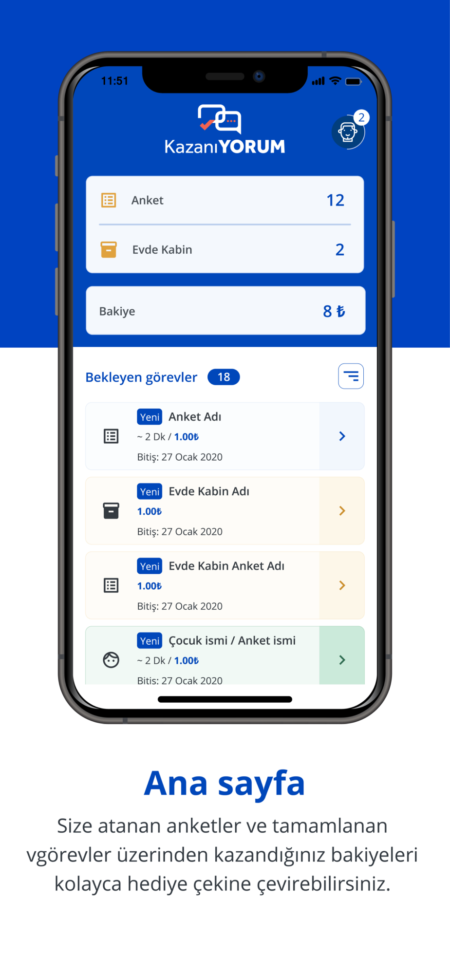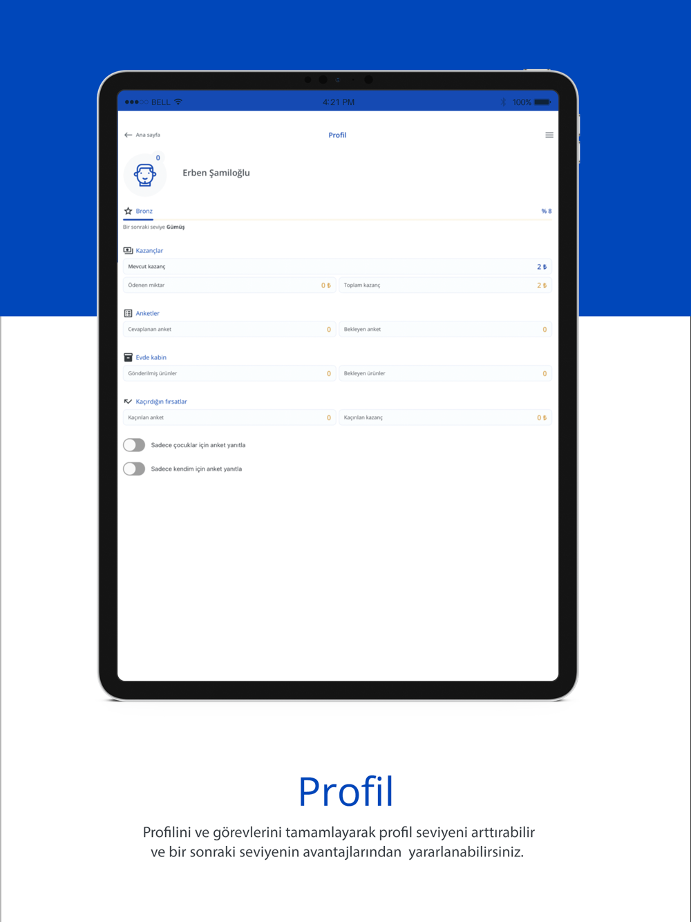 Uygulamamız ile kendiniz ve çocuğunuz için profil oluşturabilir, atanan anketleri cevapladıkça TL kazanabilirsiniz. Yakında ekleyeceğimiz Evde Kabin özelliği ile de evinizden çıkmadan size göndereceğimiz ürünleri deneyecek ve yaşadığınız bu deneyimi yorumlayabileceksiniz.