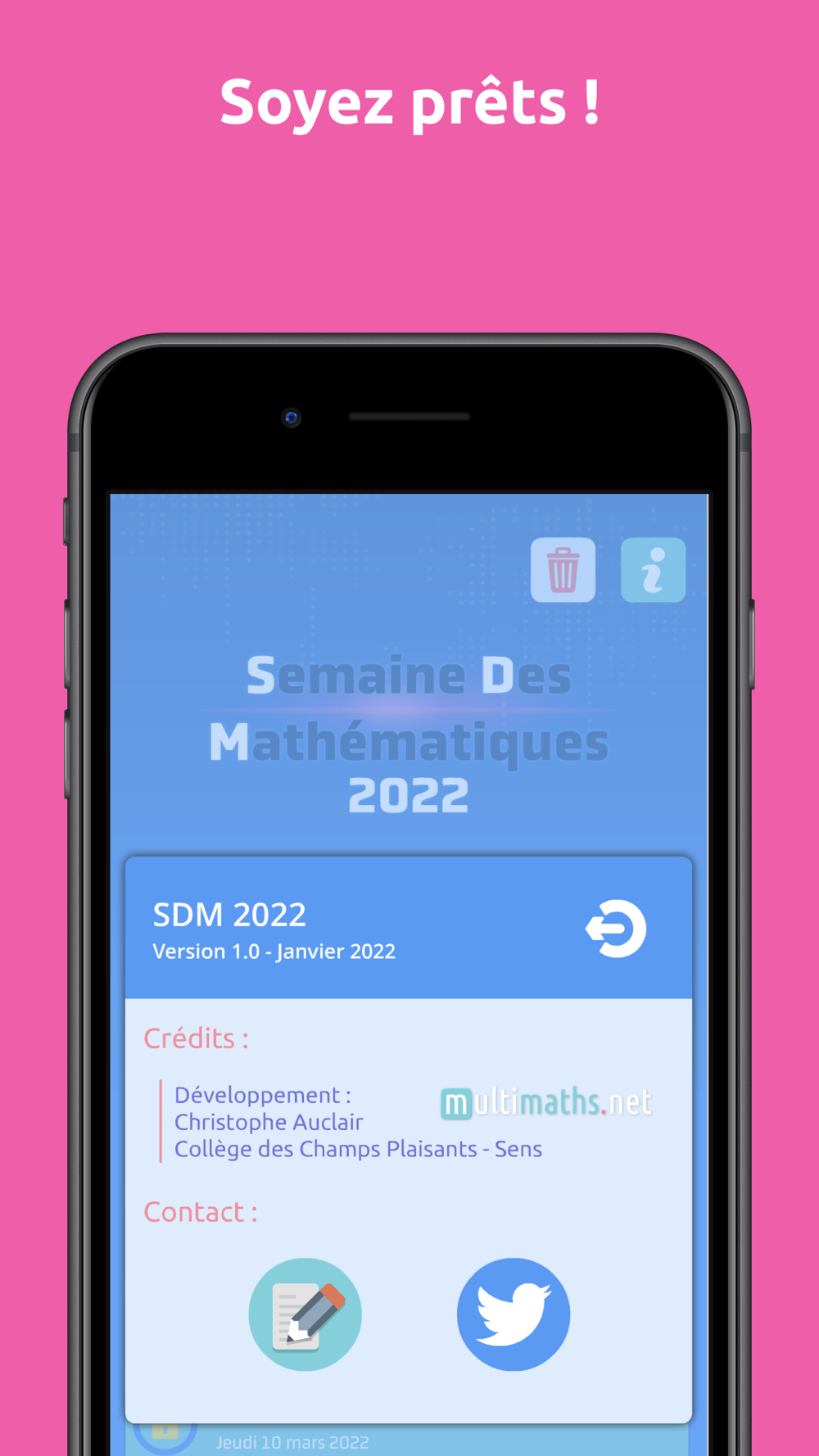 L'application SDM 2022 est destinée à être utilisée dans un établissement scolaire (école primaire ou collège) dans le cadre de la semaine des mathématiques. Elle permet la mise en place d'un concours d'énigmes, sous la supervision d'un enseignant référent qui collecte les réponses et établit un (ou plusieurs) classements.