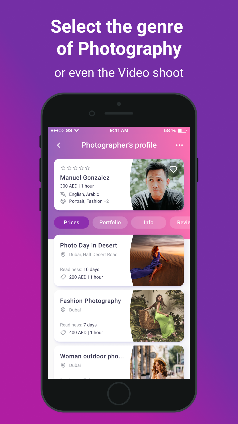 Choose the genre of photography, the language in which you would like to communicate with the photographer,