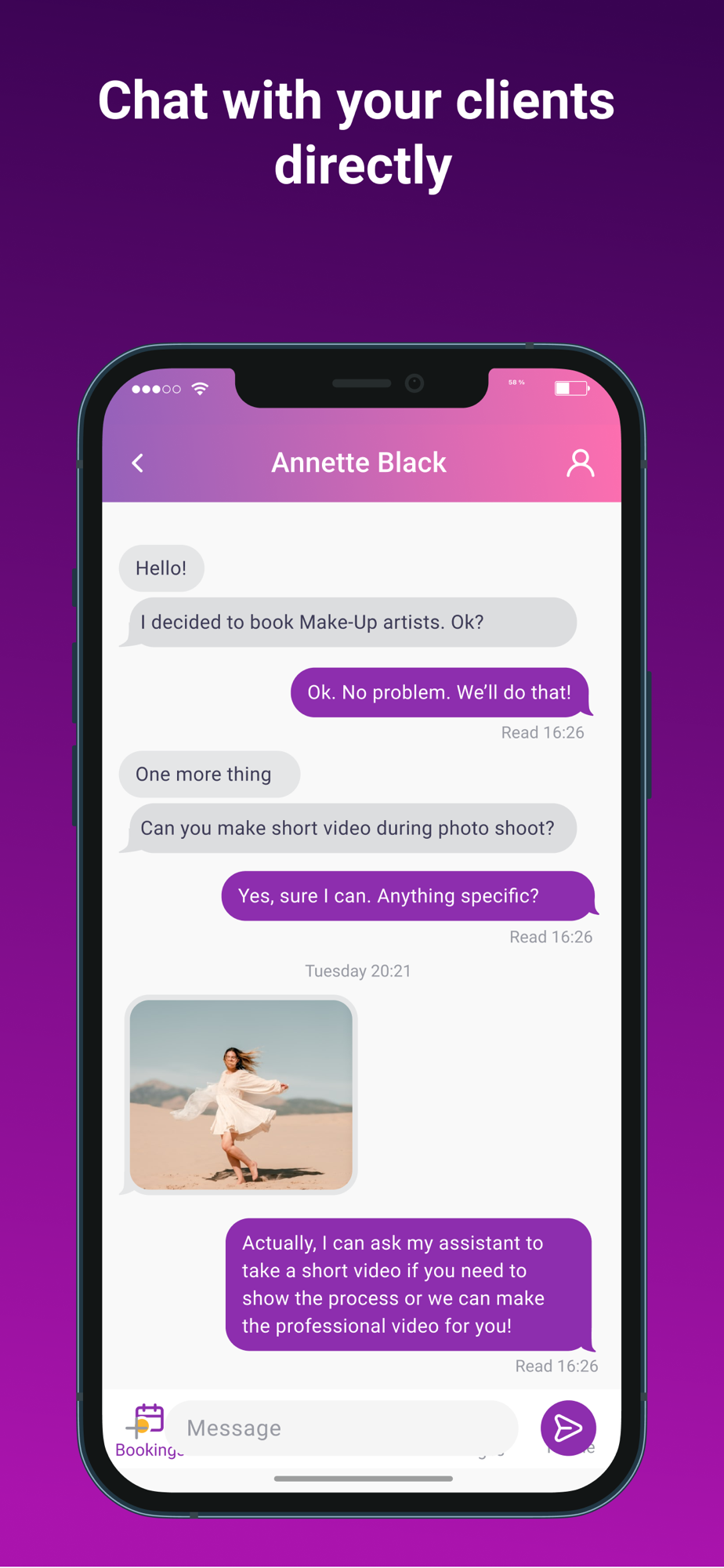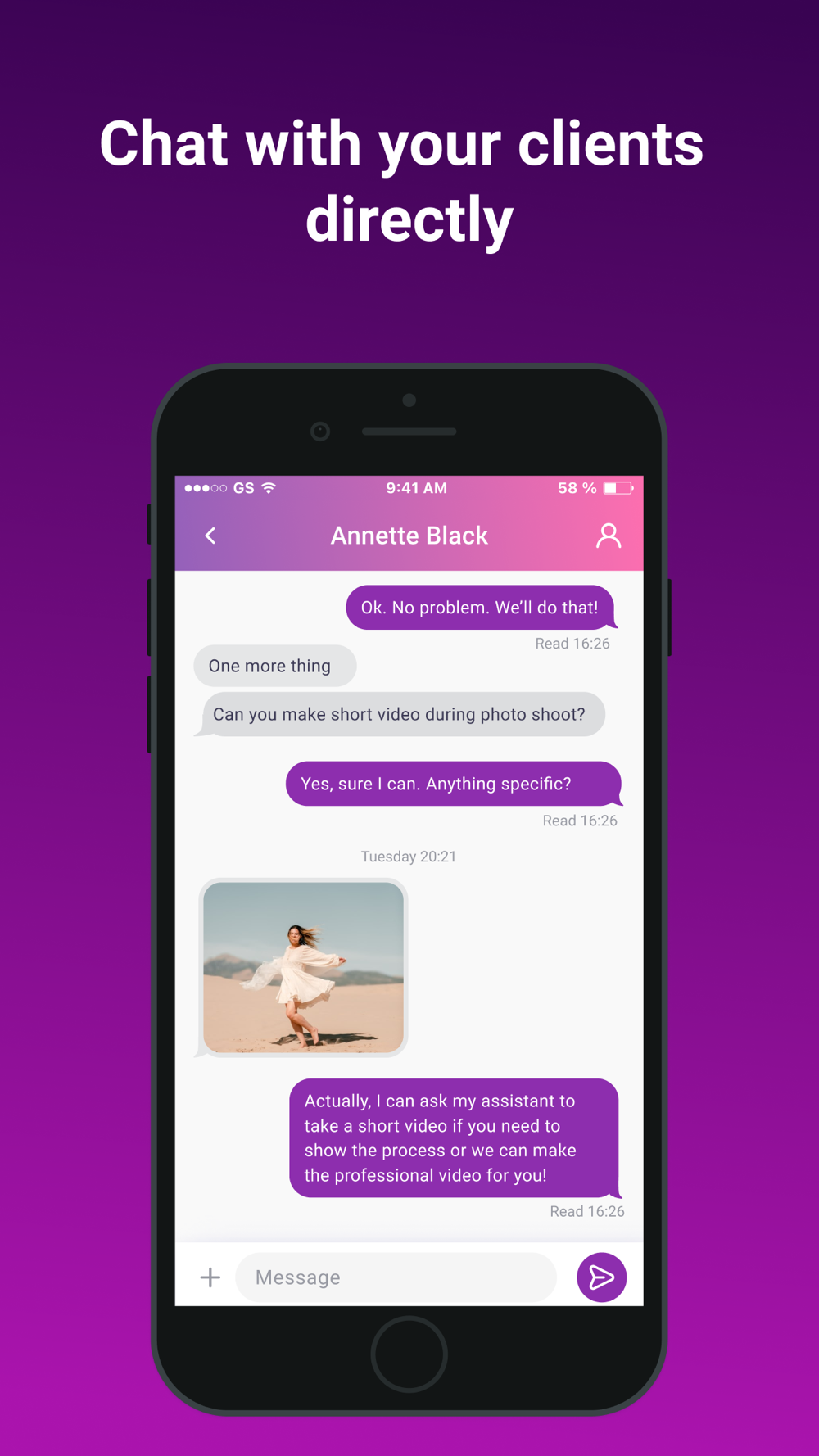 Chat with the client to discuss shooting and order details.