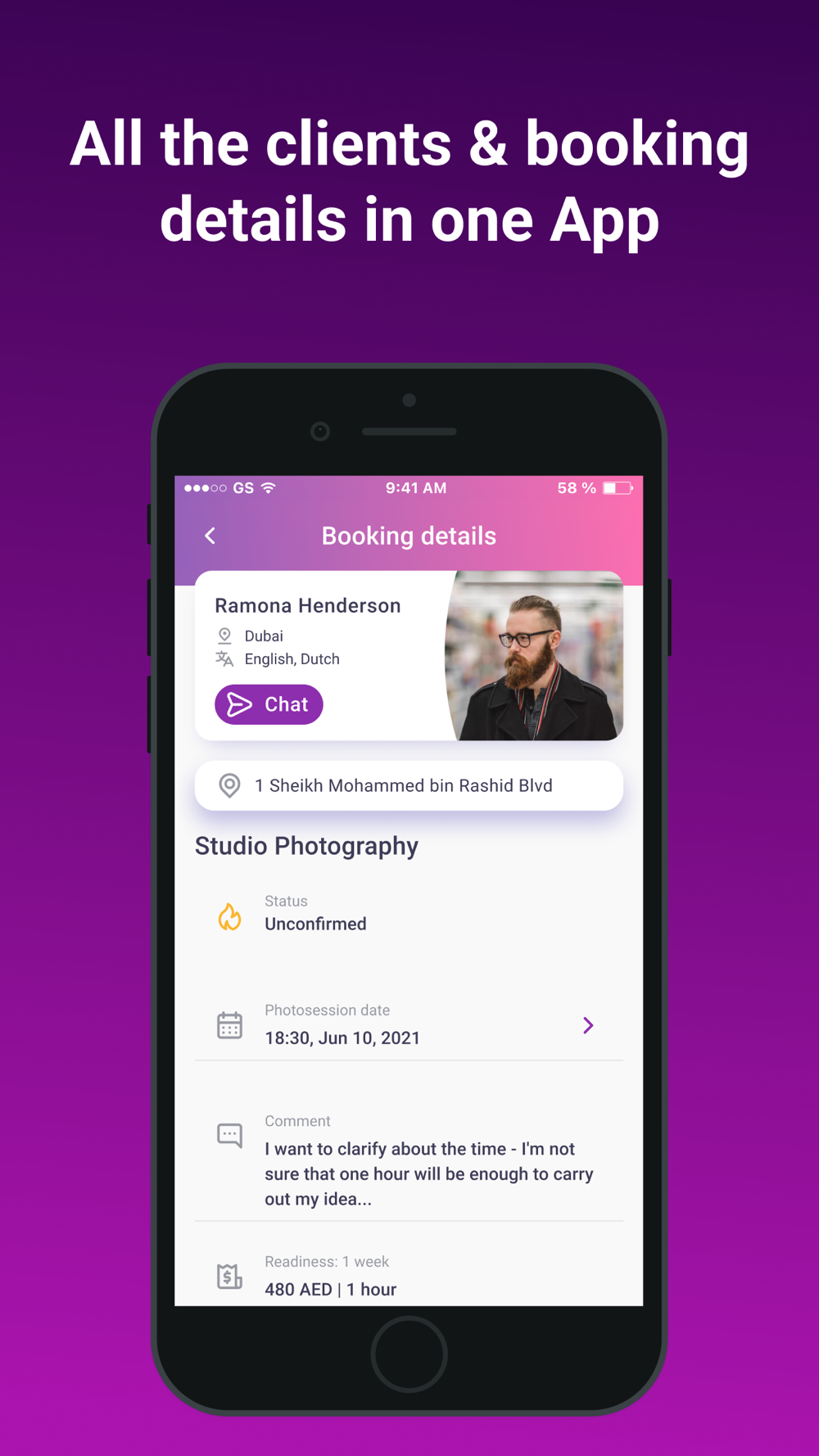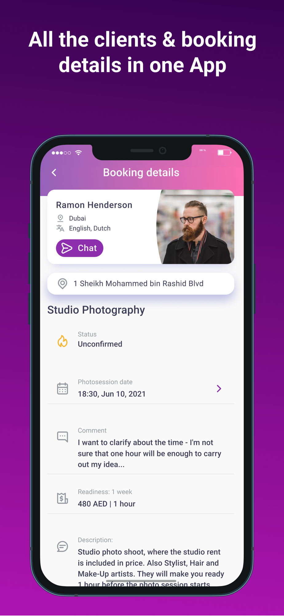 Personal account with the history of all orders and information about the client and photo shoot, location, duration, timing of the transfer of photos and the price all in one application!