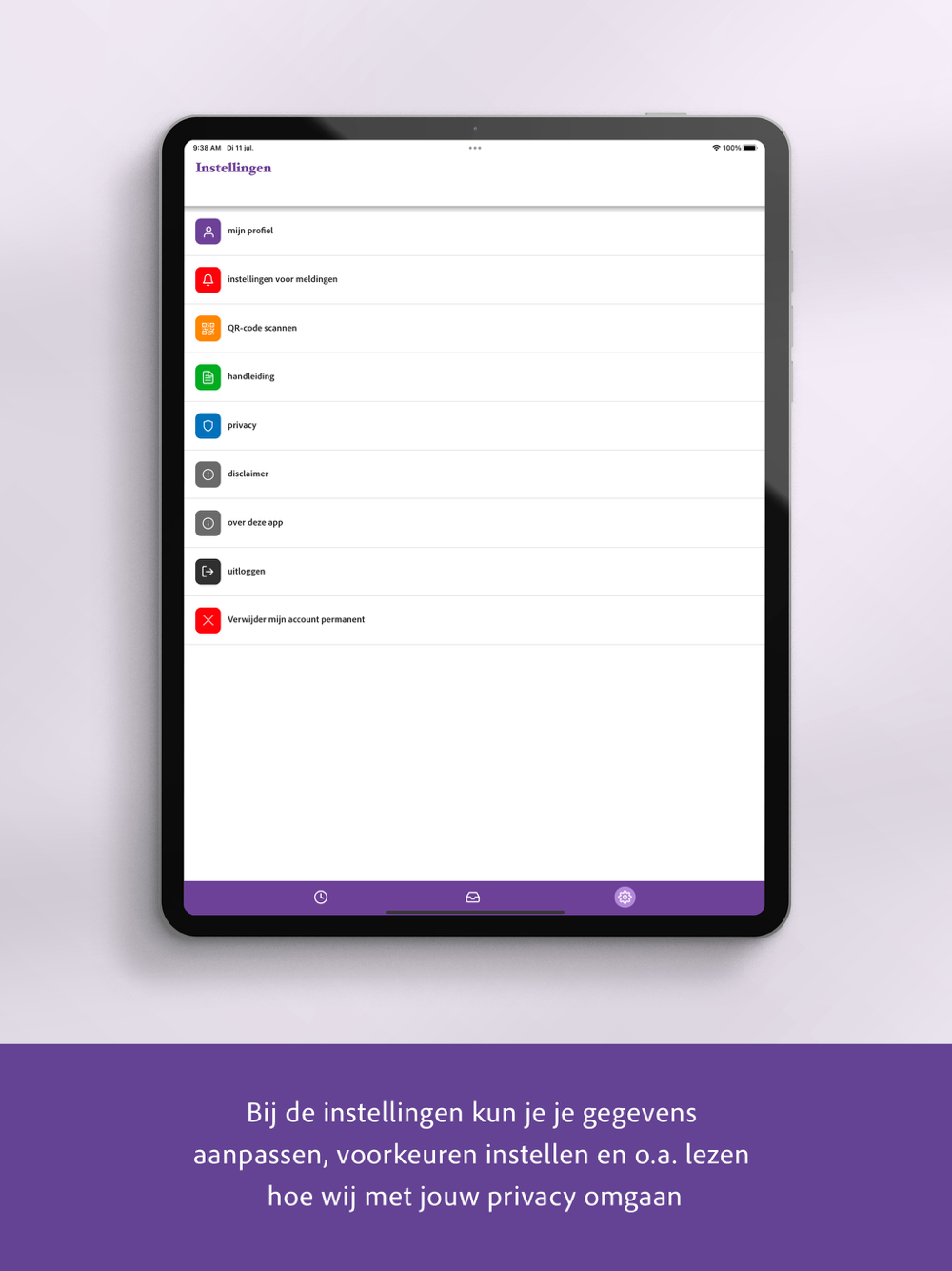 Bij de instellingen kun je zien met welke gegevens je bent aangemeld en kun je je postcode wijzigen als je verhuisd bent. Ook kun je hier aangeven voor welke categorieën je een pushbericht wilt en welke niet. Je vindt er een link naar de handleiding van Youmee, onze privacy voorwaarden, een disclaimer en contactinformatie van de ontwikkelaar. Tot slot kun je hier uitloggen.