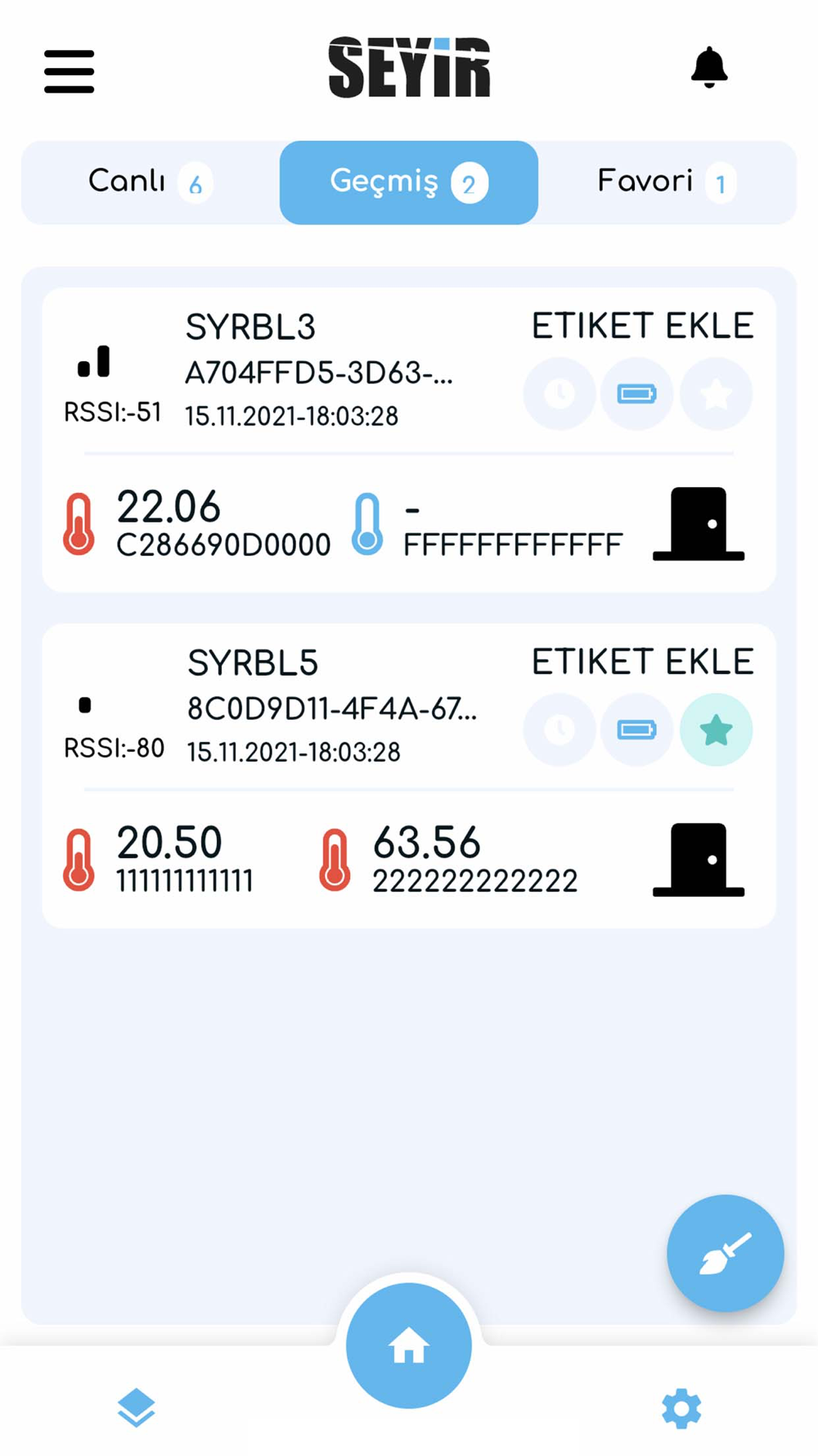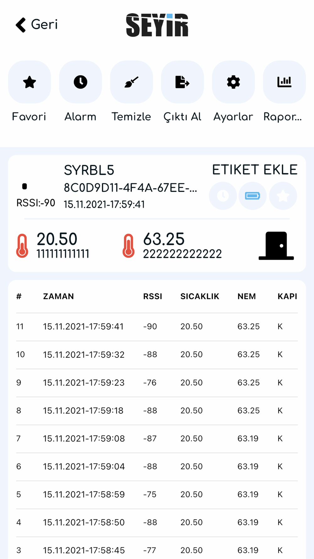 Uygulama; Seyir BLE cihazlarının bulunduğu ortamdaki kapı, sıcaklık ve nemi anlık olarak izlemenizi sağlar. İstediğiniz nem, sıcaklık ve kapı durumuna göre alarm kurabilir, ortamı rahatlıkla kontrolünüz altında tutabilirsiniz.
