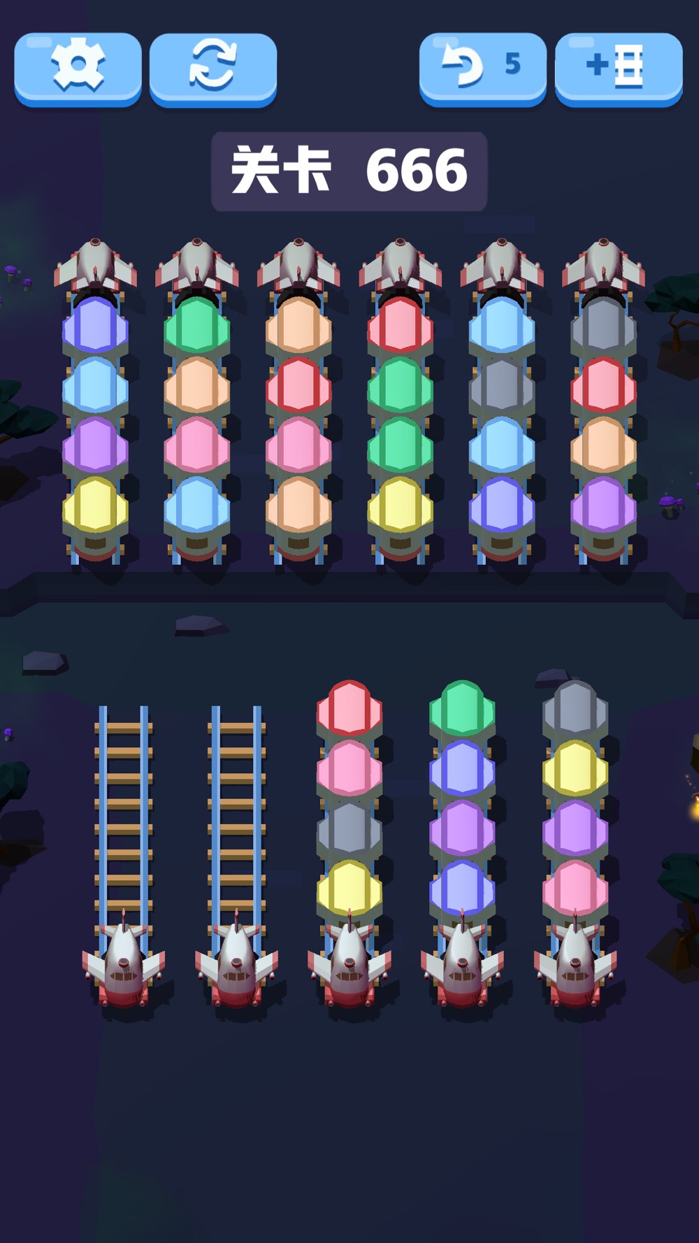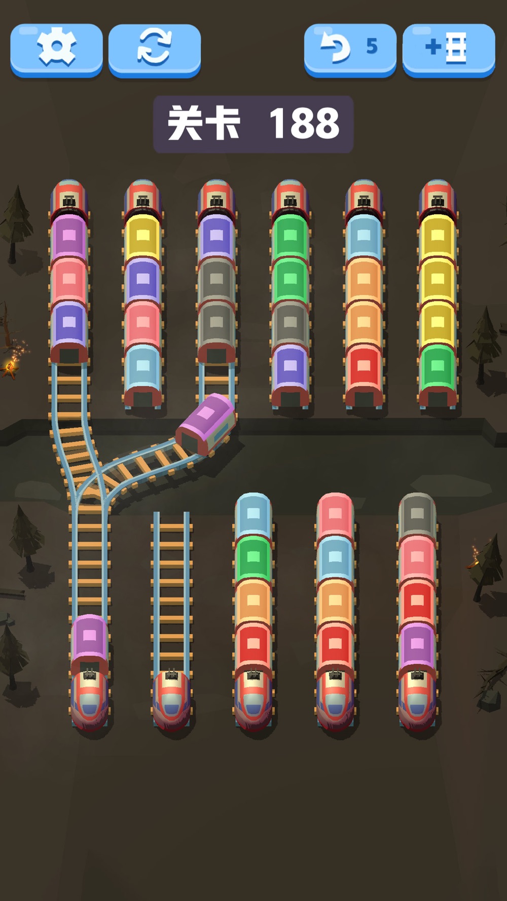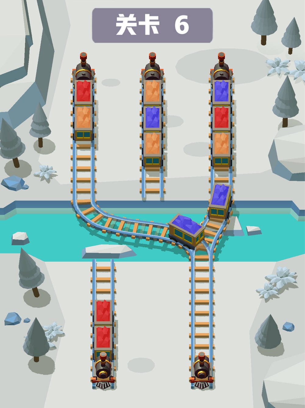 通过逻辑推理,将相同颜色的小火车移动至同一轨道中
