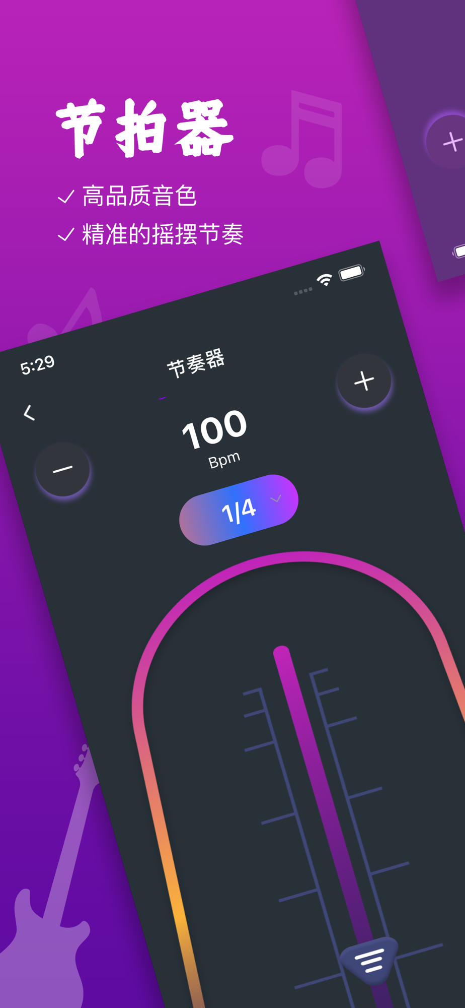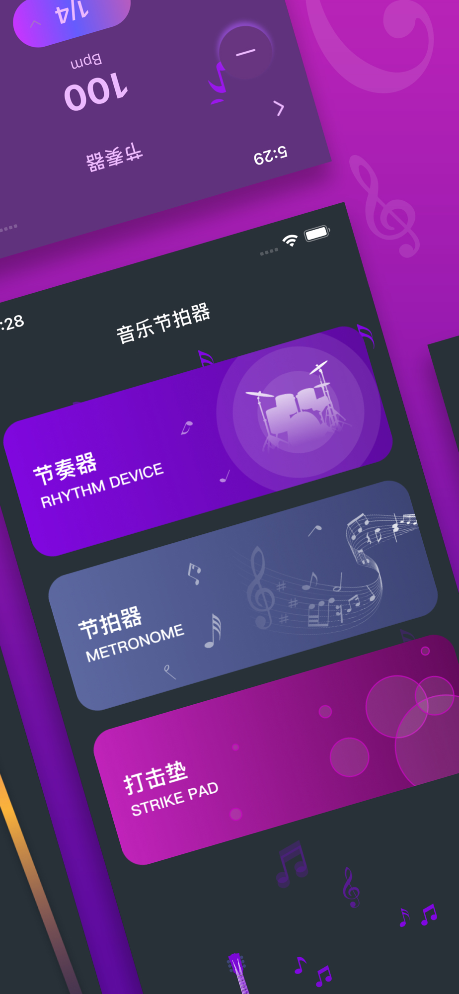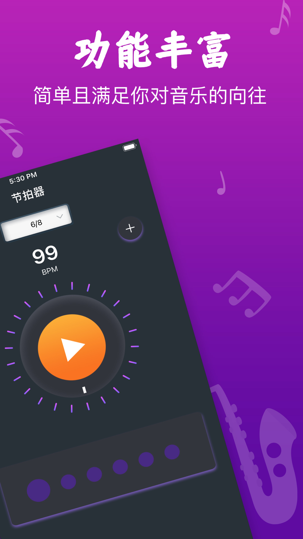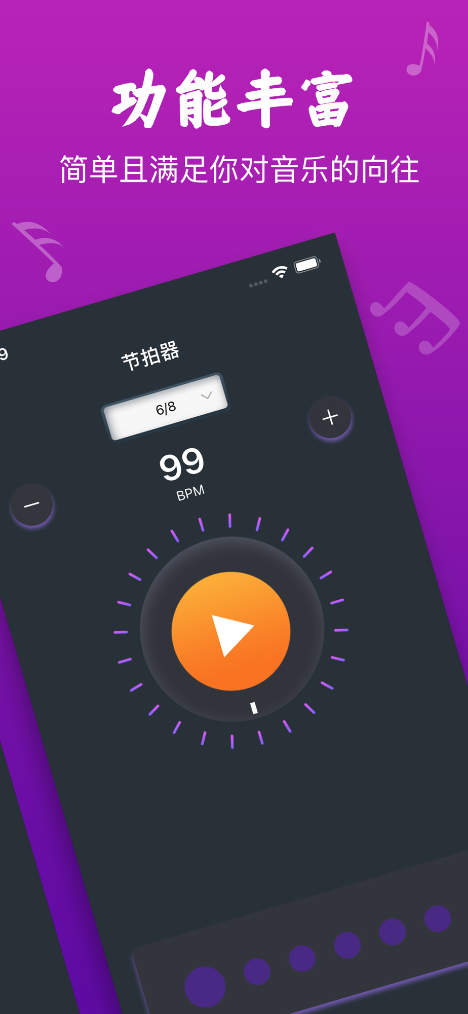 一款音乐节拍器,和物理节拍器一样使用!界面简洁清新,bpm随意调整,节拍模式供你选择,节奏体验,节拍准确,旋转圆盘控制节拍频率。
