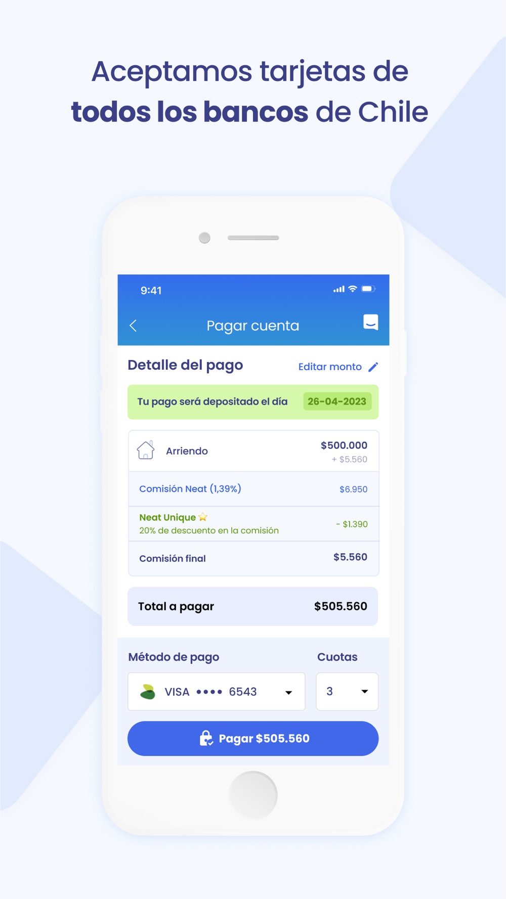 Neat es un portal de pagos de cuentas online que te permite pagar con tarjeta de crédito el arriendo, gasto común, jardín infantil, entre otras, automatizar pagos, ganar orden y beneficios.