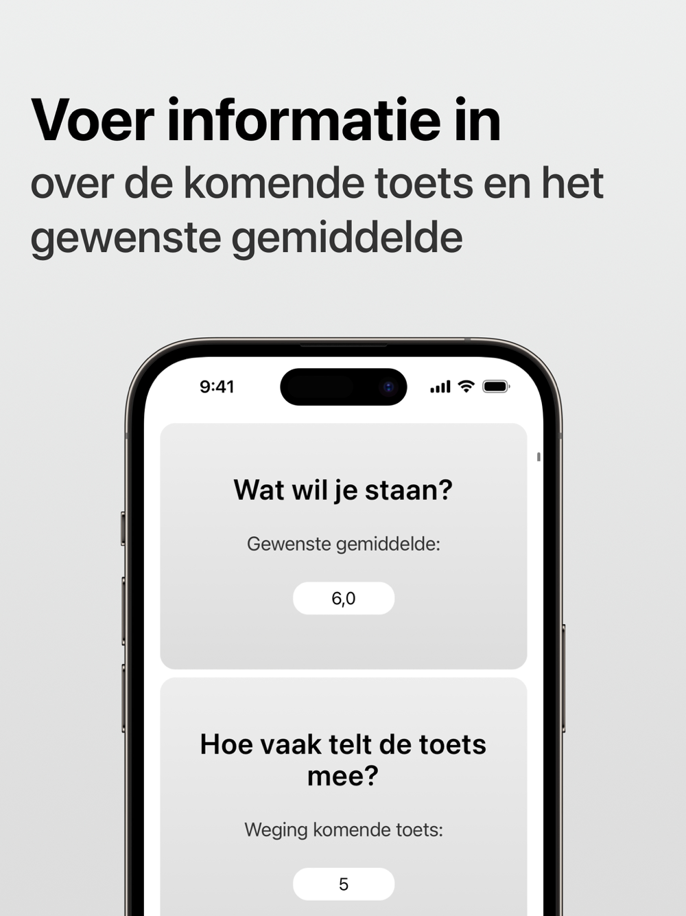Vul de informatie in over je komende toets en het gewenste gemiddelde.