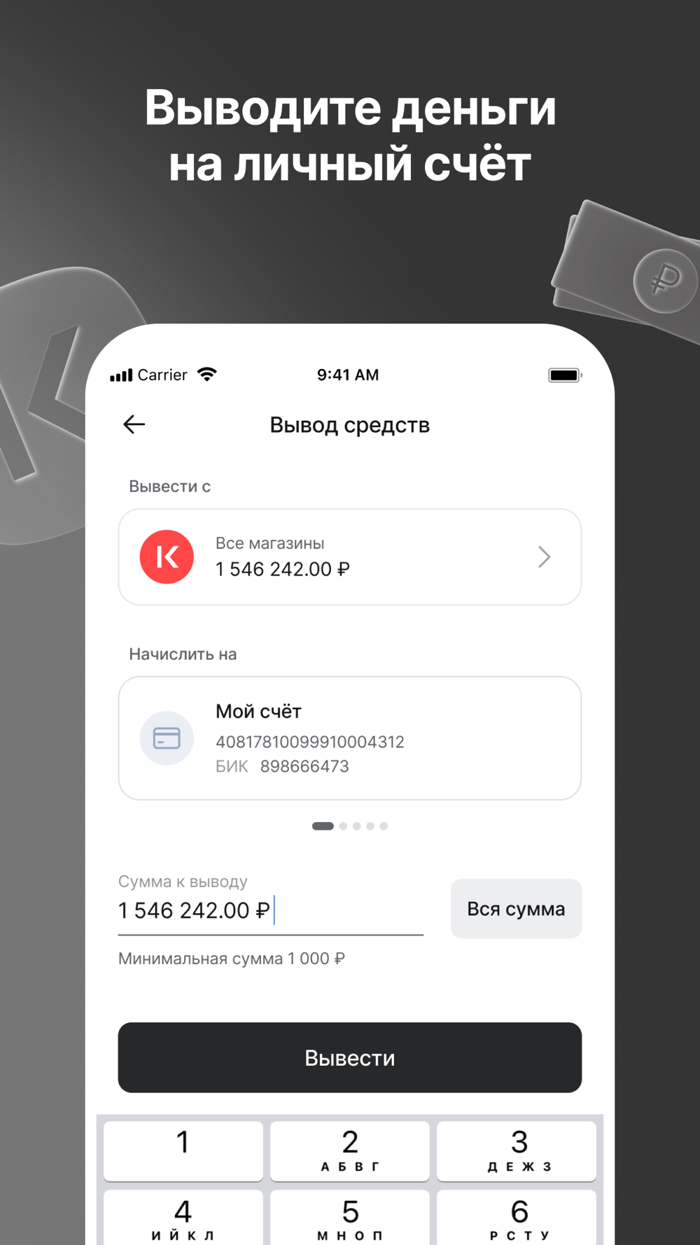 Просмотр баланса счета продавца и вывод средств на личный счет