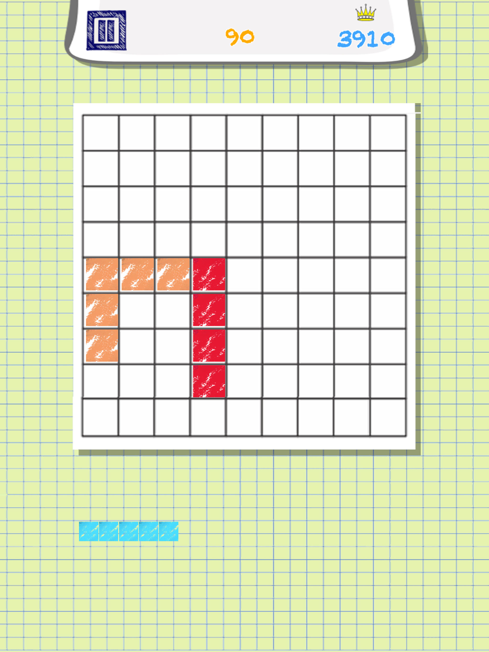 Put different color of block on the checkered paper. It can be arranged in one or more rows. Vertical or horizontal defecation will eliminate one or more rows and get high scores.