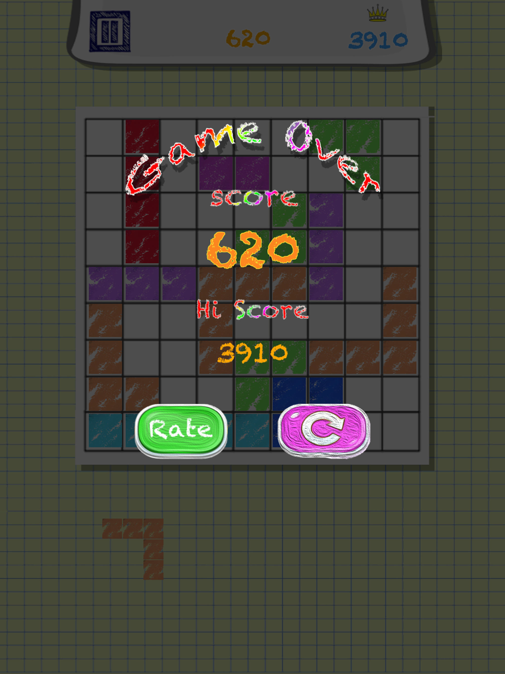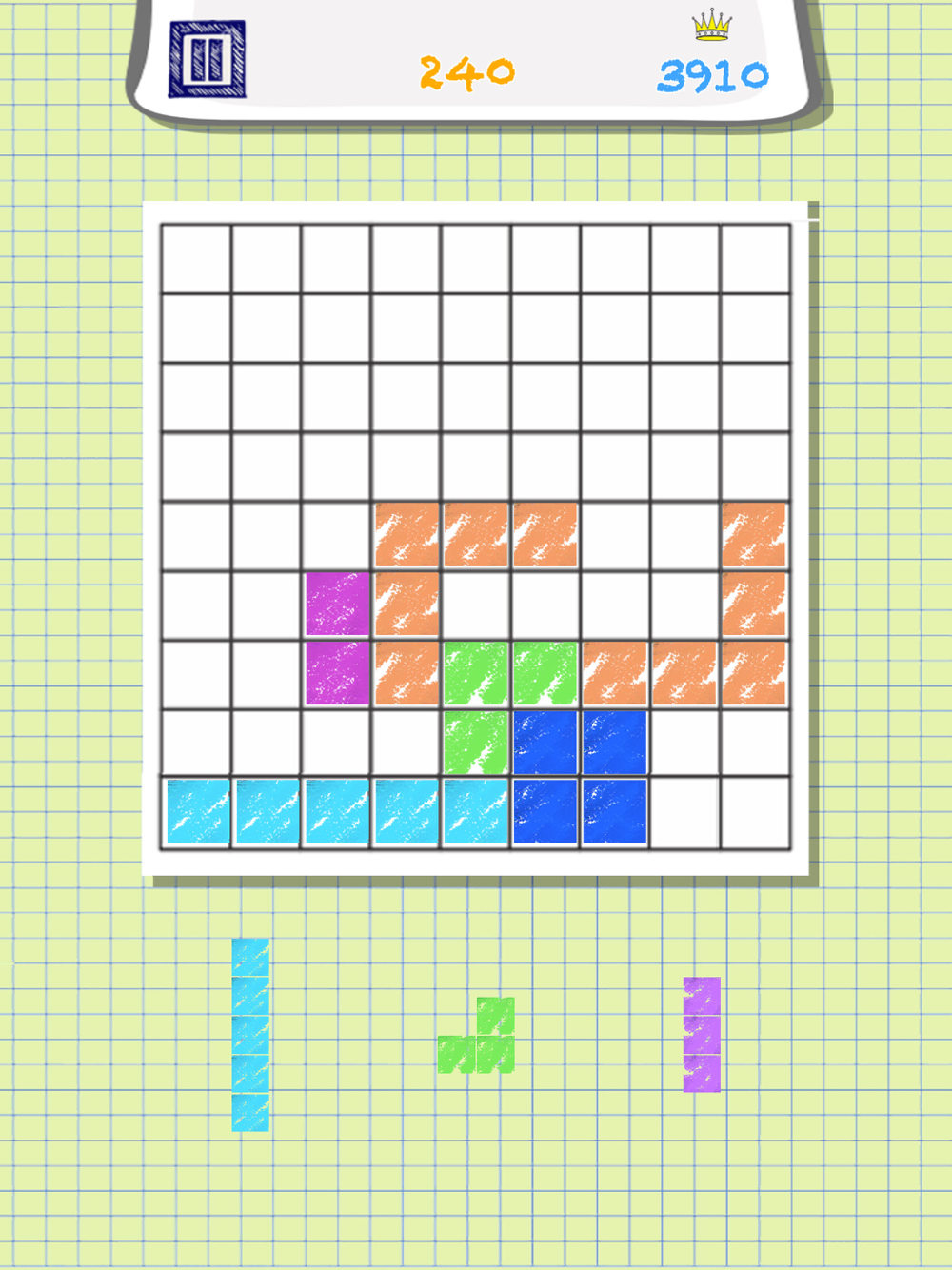 把不同顏色方塊放到格仔紙上 能排成一行或多行 直排或橫排便會消除一行或多行 取得高分