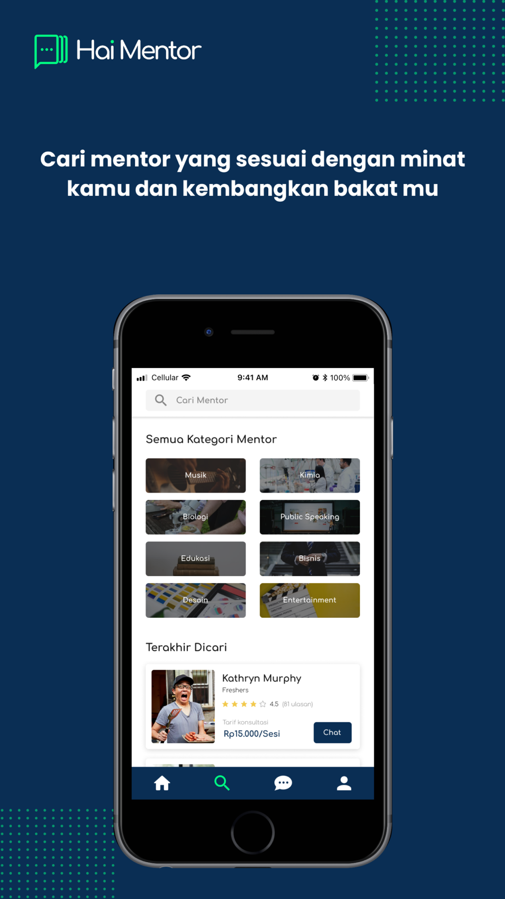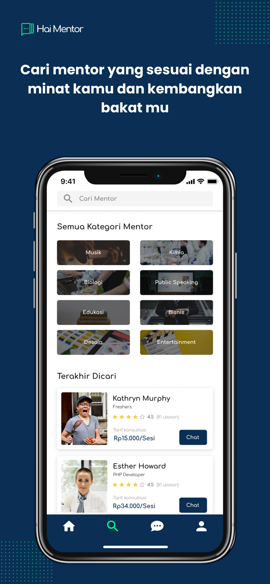 Dengan Hai Mentor kamu bisa menelusuri berbagai mentor ahli dari berbagai bidang yang ingin kamu kuasai mulai dari mentor Akademik, Seni & Kreatif, Teknologi, Bisnis, Kesehatan, Entertaiment, Psikilogi hingga Rohani.