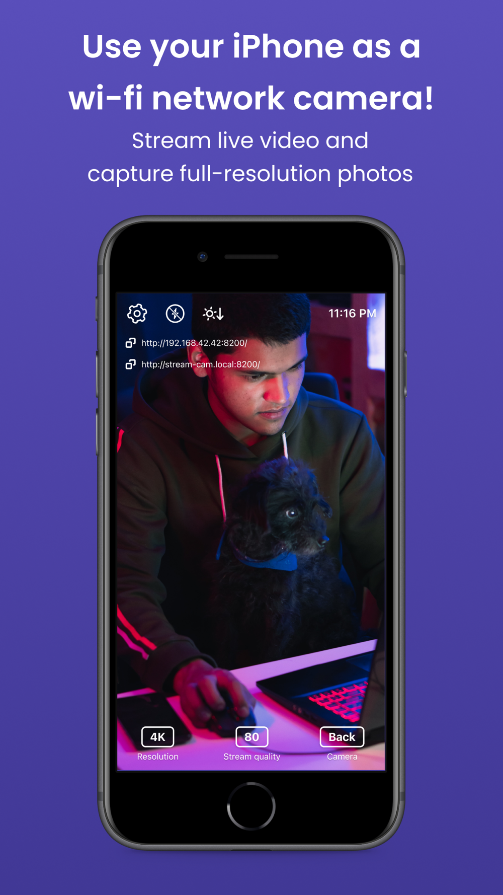 Super NetCam turns your iOS device into a high quality network webcam. Access a live video feed from any modern web browser, remotely trigger full resolution photos, change camera settings from your browser, and more.