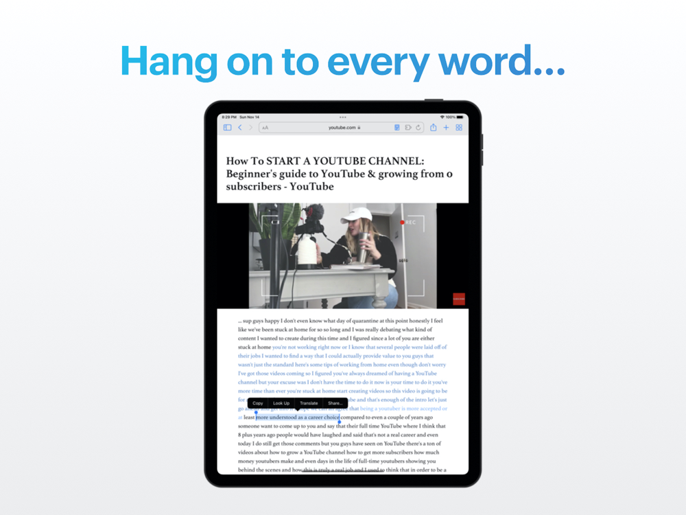 Transcript Reader does for subtitles what Safari's default "reader mode" does for articles: create a comfortable reading experience. But its usefulness extends beyond enabling users to focus on video content: Transcript Reader invites video watchers to select, search, copy, Quick note, and read ahead in the transcript. Whether you're a student trying to focus on a lecture, whether you have ADHD and find websites distracting, whether you have a hearing impairment and rely heavily on transcripts, or whether you have some sort of vision impairment that makes reading "on video" subtitles challenging Transcript Reader is for you.