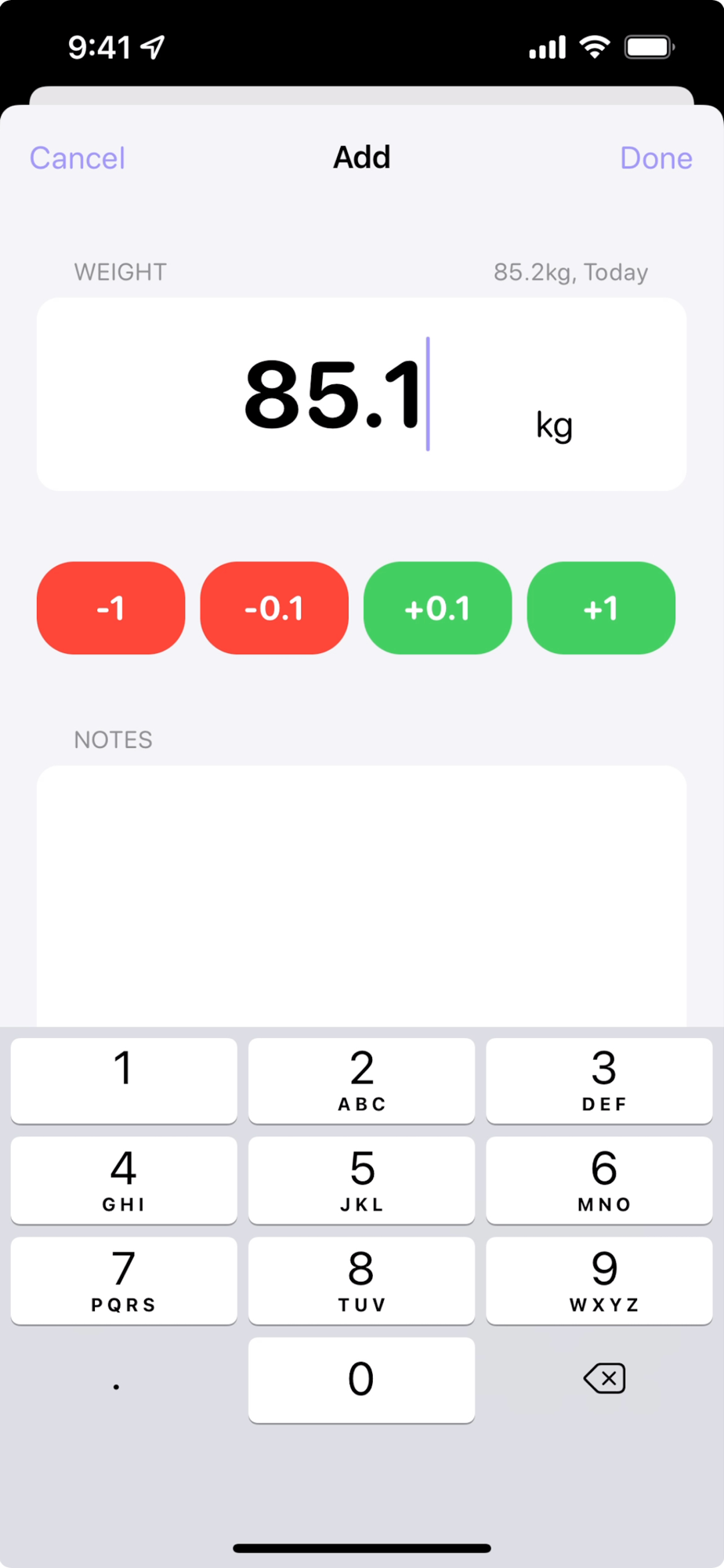 Keep track of numbers such as weight, push-up counts, squat counts with JustTrack. You can combine it with other health related info such as steps, exercise time and calories. This will give you insight and help you achieve goals.