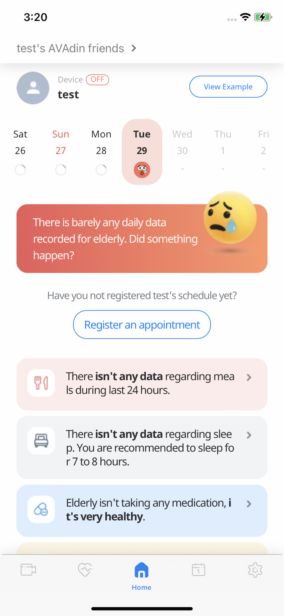 - Daily Report: On one screen view an AVAdin Friends user's latest activities, number of responses per day, history of emergency calls, dementia prevention quiz rate, response rate to chatbot conversation, emotions statistics from conversation, and history of real-time activities with ease.