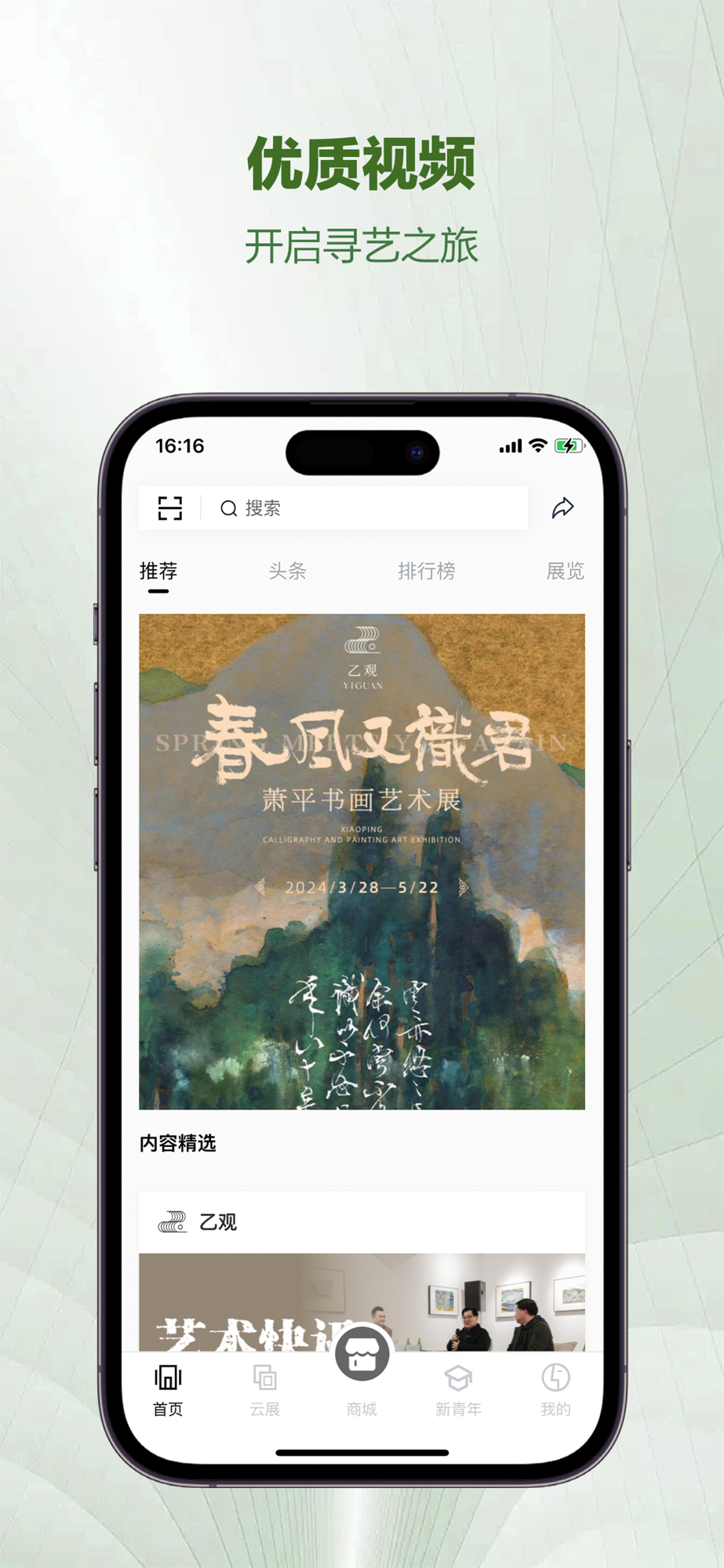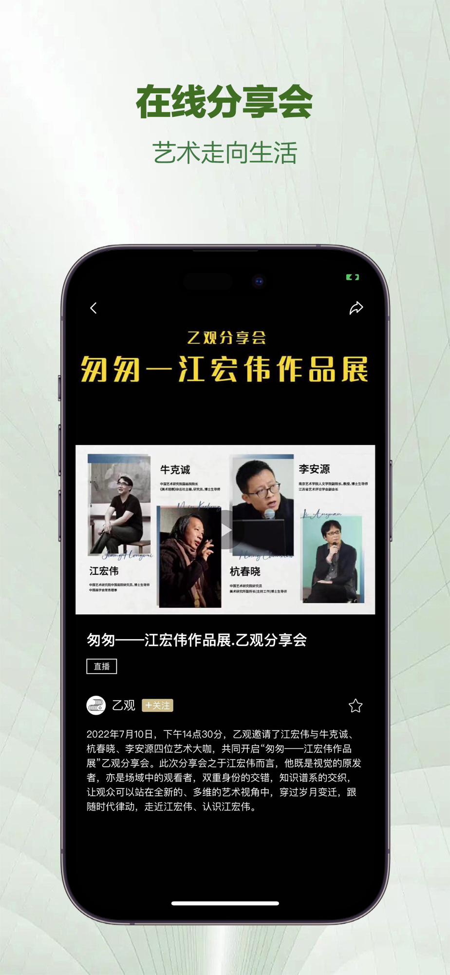 乙观是国内先进的垂直于艺术行业的短视频生产者,专注为各类艺术家提供适合移动终端观看和分享的内容产品,内容涵盖艺术家作品赏析、个人虚拟展厅、短视频流媒体库等原创新媒体内容,凭借着国内一线艺术家短视频资源库,成功跻身国内知名艺术内容平台!同时,乙观也是国内先进的艺术家互动社区和艺术品交易平台之一,聚集着经过机构认证的数百名具有专业学术实力的一线艺术家。大家可以直面艺术家了解创作背后的故事,在线下单和艺术完美邂逅!