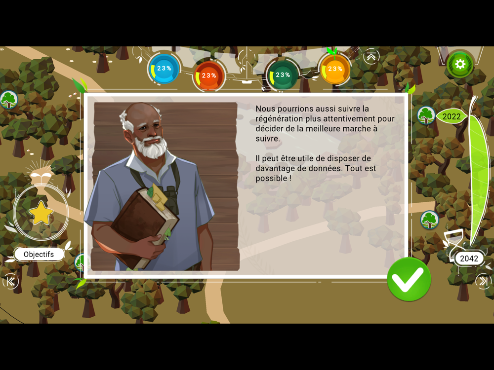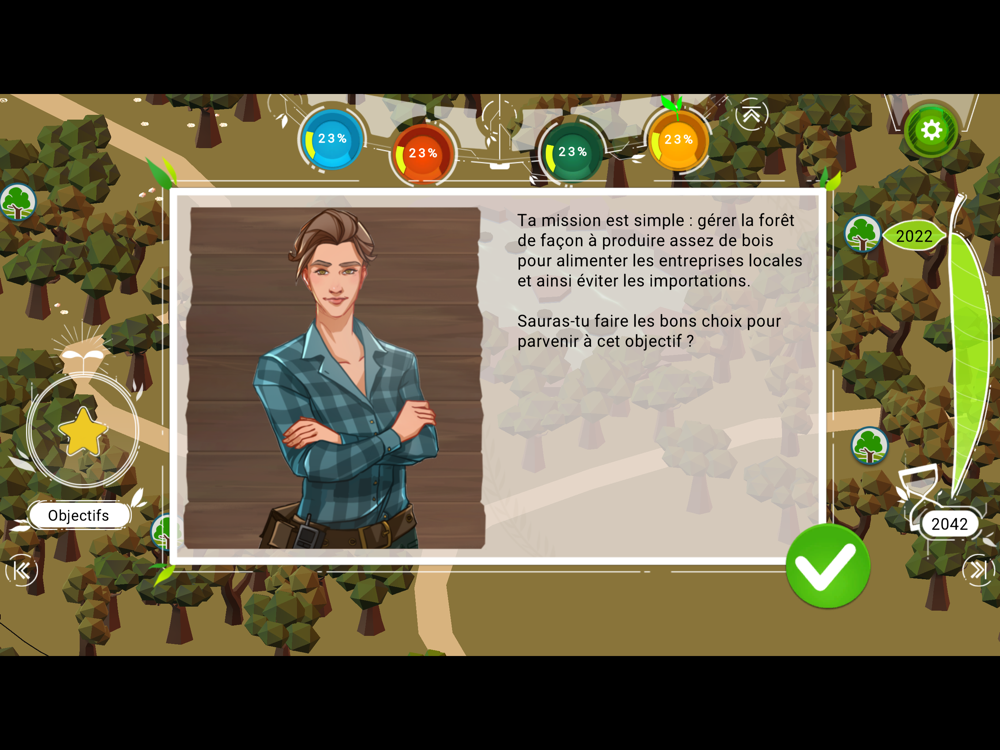 Ce jeu est l’occasion d’expérimenter des solutions à partir de scénarios tirés de l’expérience réelle de forestiers. Une fois toutes les missions réussies, le jeu offre la possibilité de passer une demi-journée avec un acteur de la filière Forêt-bois !