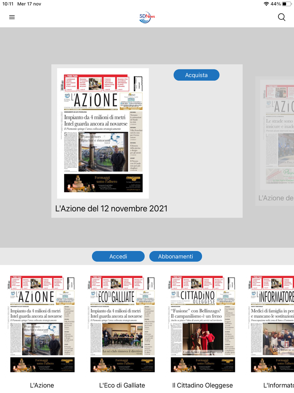 Con la nostra applicazione potete ora leggere in digitale tutte e dieci le nostre edizioni con un singolo abbonamento: L’Azione di Novara, L'Eco di Galliate, il Cittadino Oleggese, Il Ricreo di Bellinzago, Il Sempione, L’Informatore di Borgomanero, Il Monte Rosa, L’Informatore del Cusio, Il Verbano e il Popolo dell’Ossola.