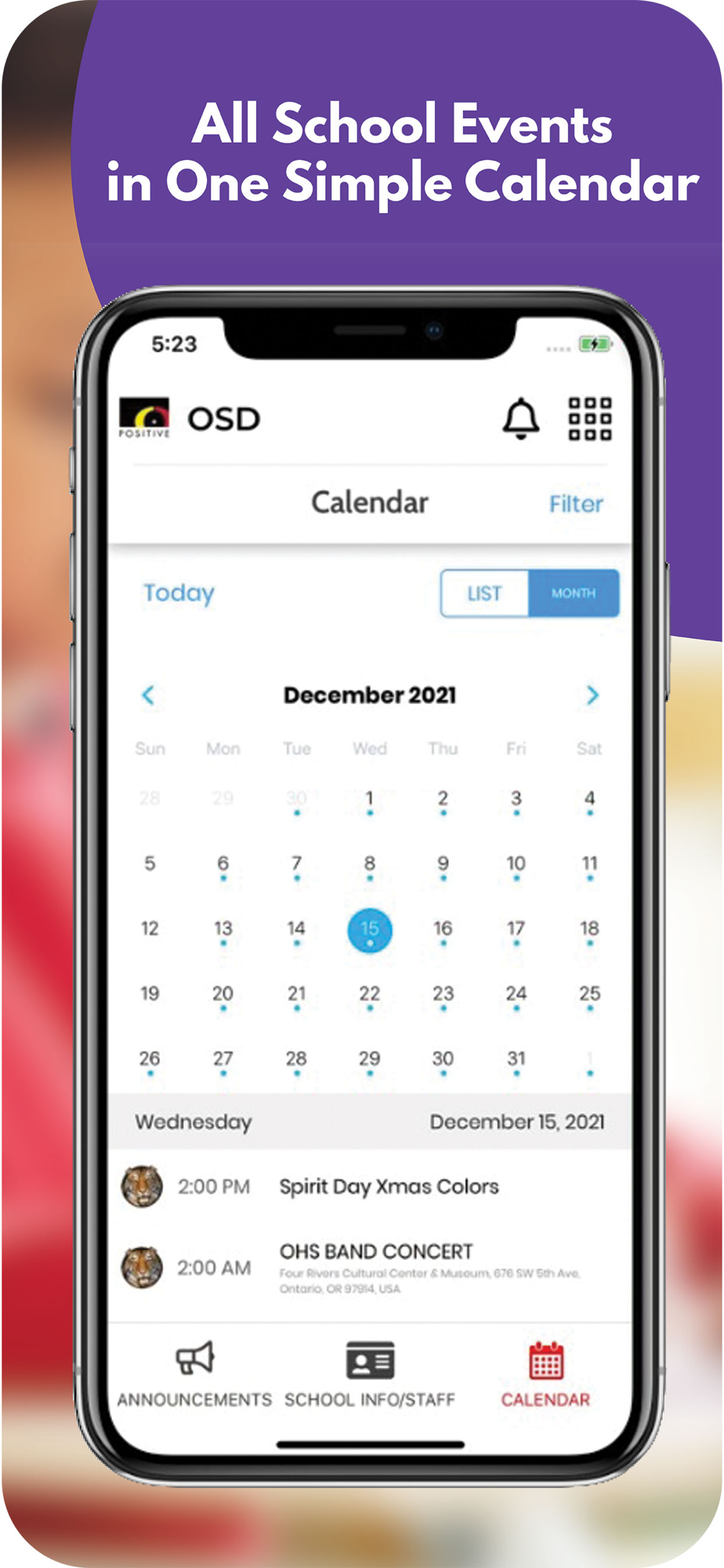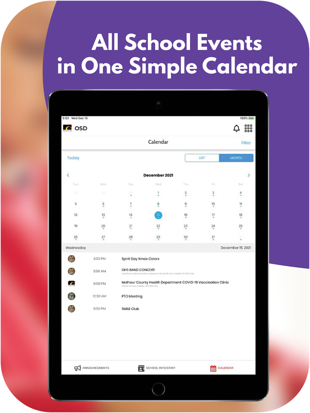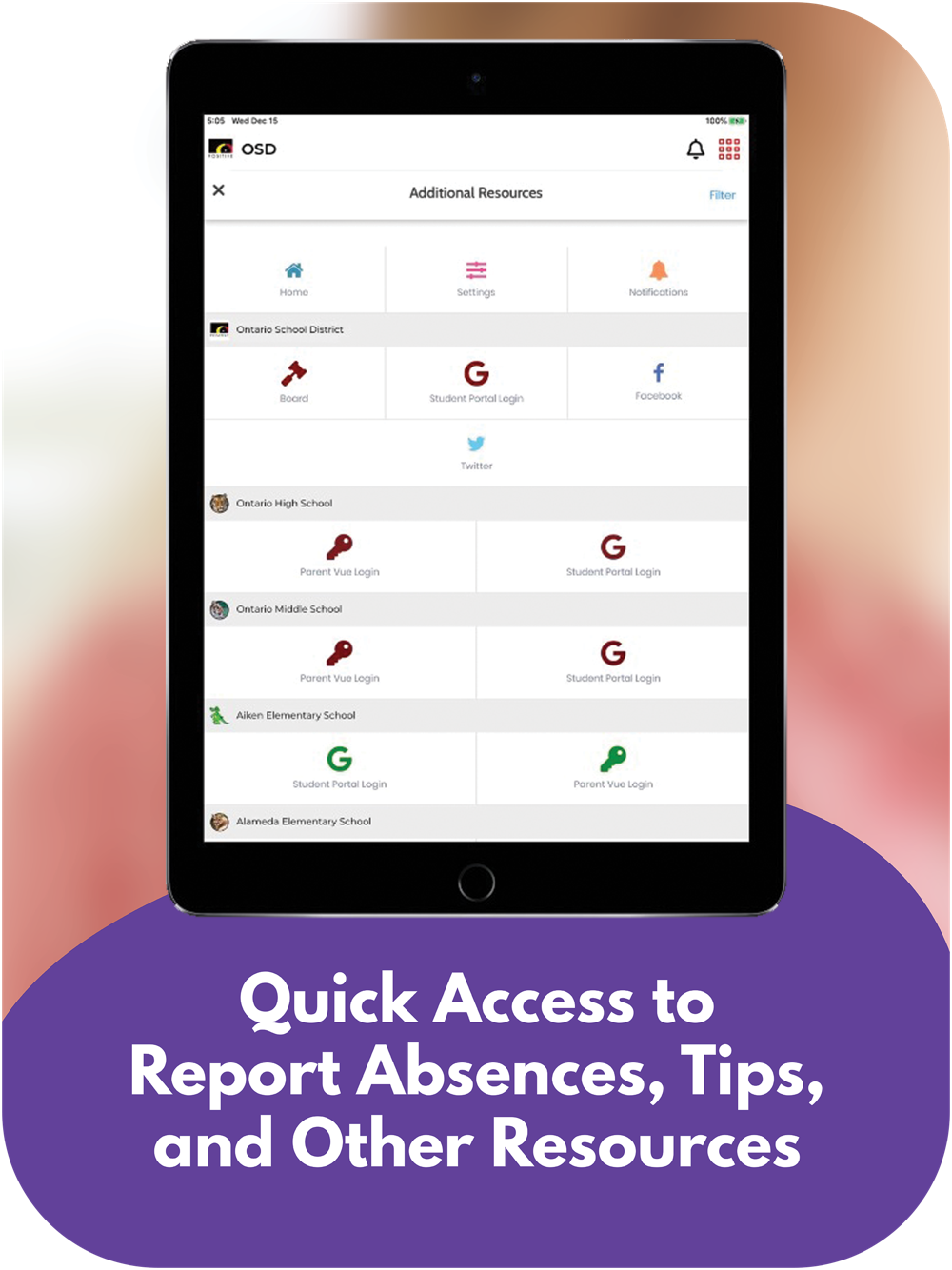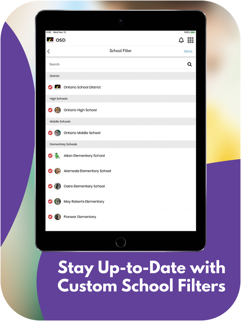 The app includes information for the district and all schools. Filter by the school your child attends to feature information for that school.