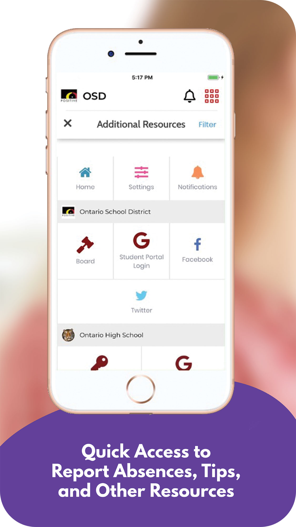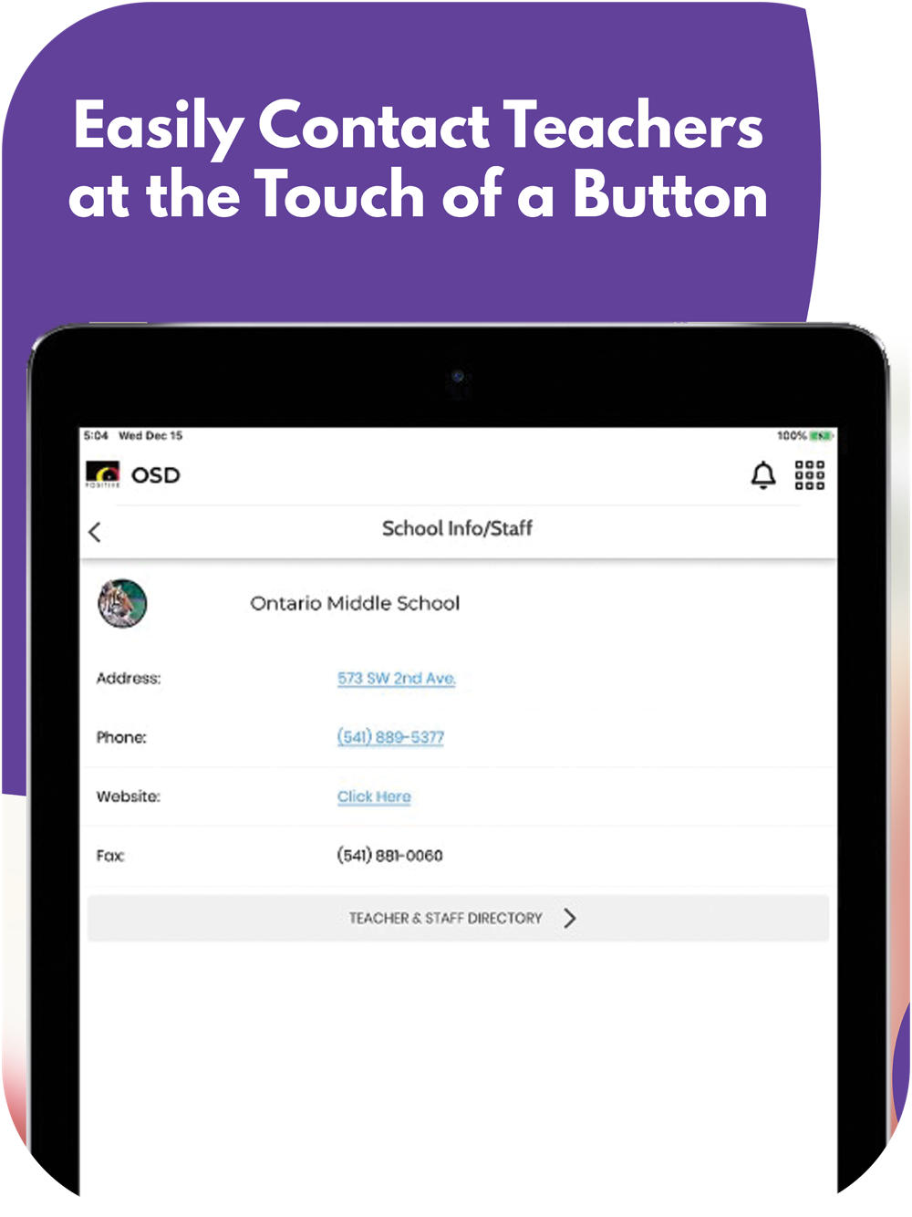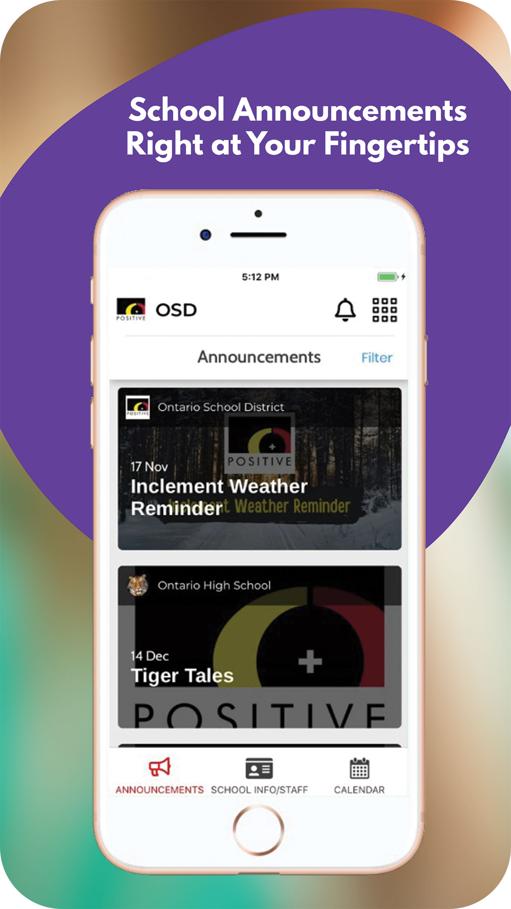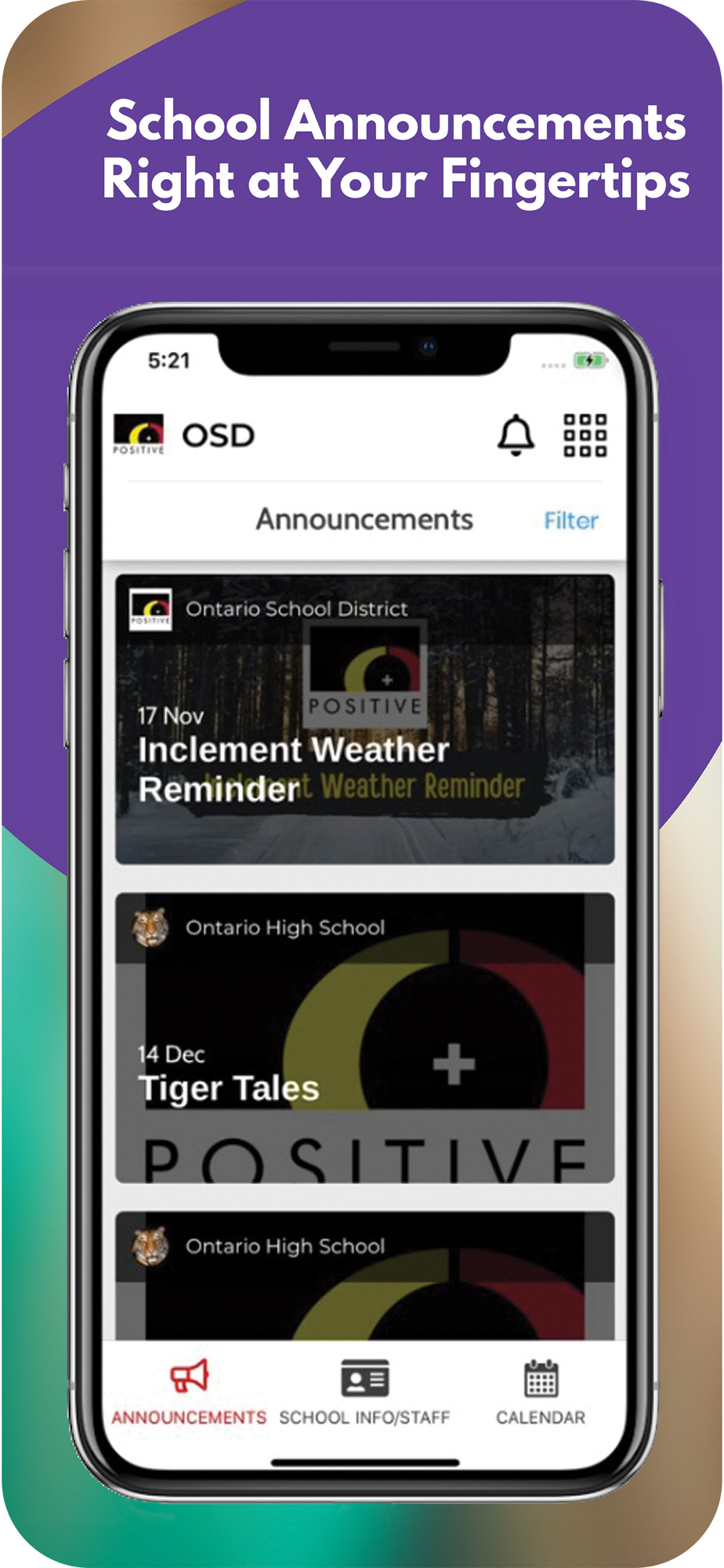The app includes information for the district and all schools. Filter by the school your child attends to feature information for that school.