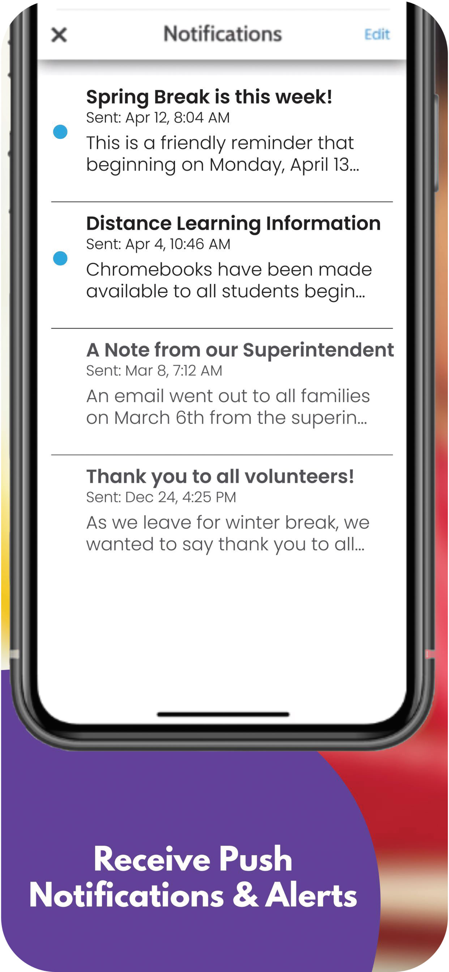 App users may opt to receive push notifications with important alerts from the district.