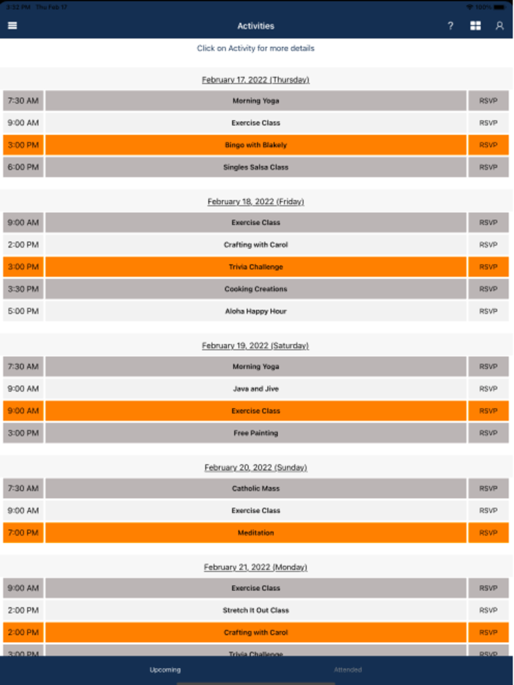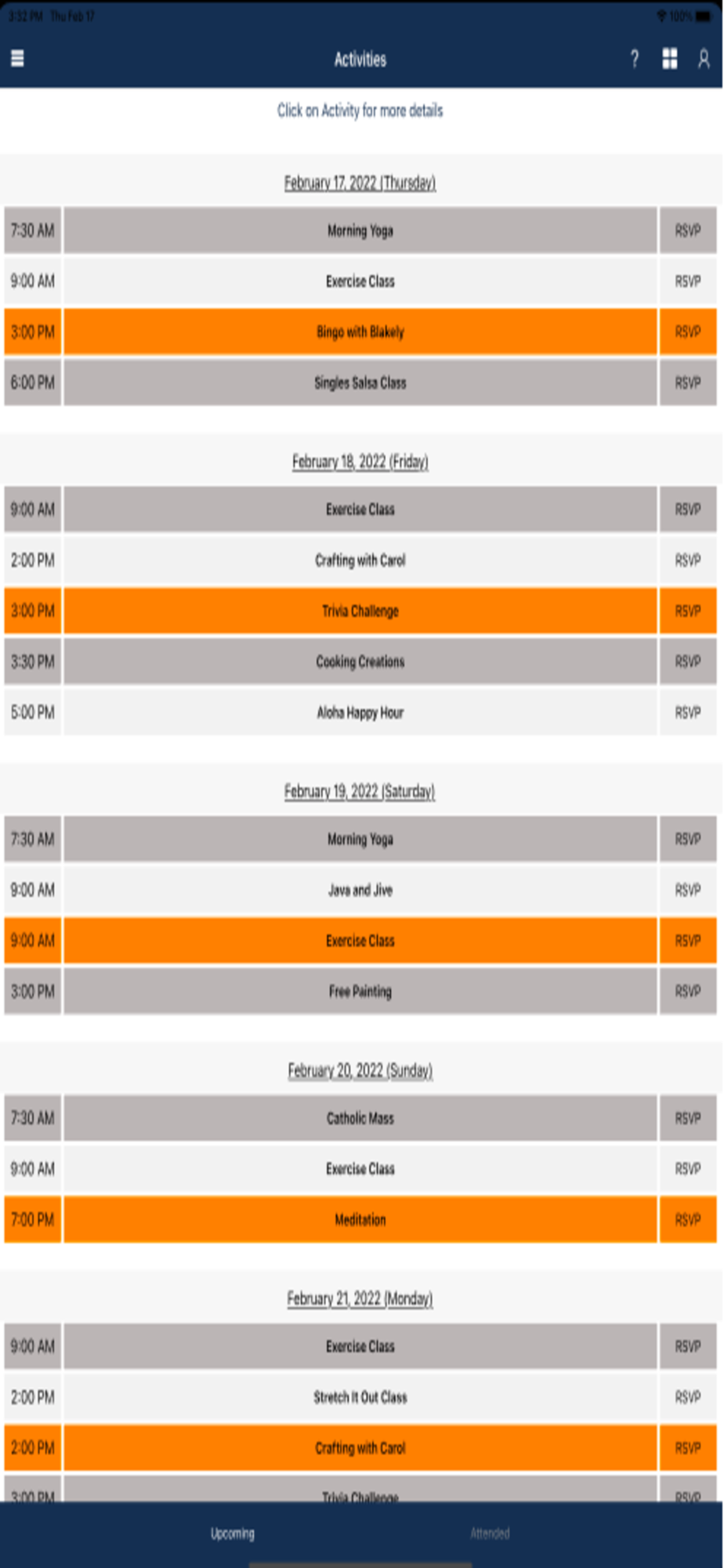 With engage, you can view a calendar of upcoming events, share your loved ones life story with their caregivers, and even see what’s on the menu!