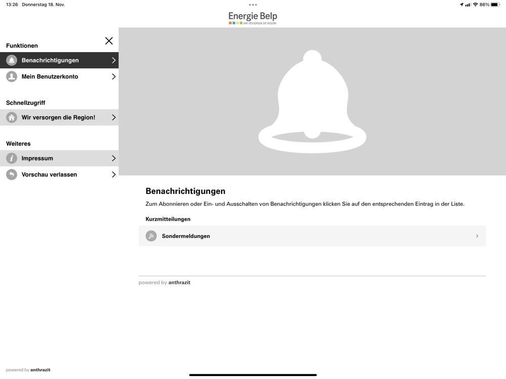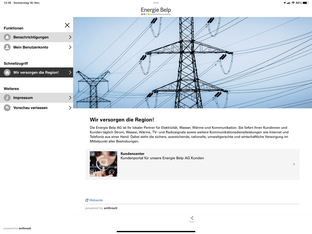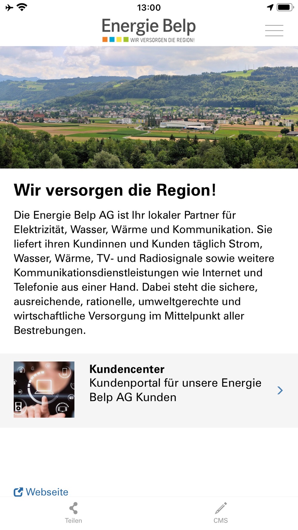 Die Energie Belp AG ist Ihr lokaler Partner für Elektrizität, Wasser, Wärme und Kommunikation. Sie liefert ihren Kundinnen und Kunden täglich Strom, Wasser, Wärme, TV- und Radiosignale sowie weitere Kommunikationsdienstleistungen wie Internet und Telefonie aus einer Hand.